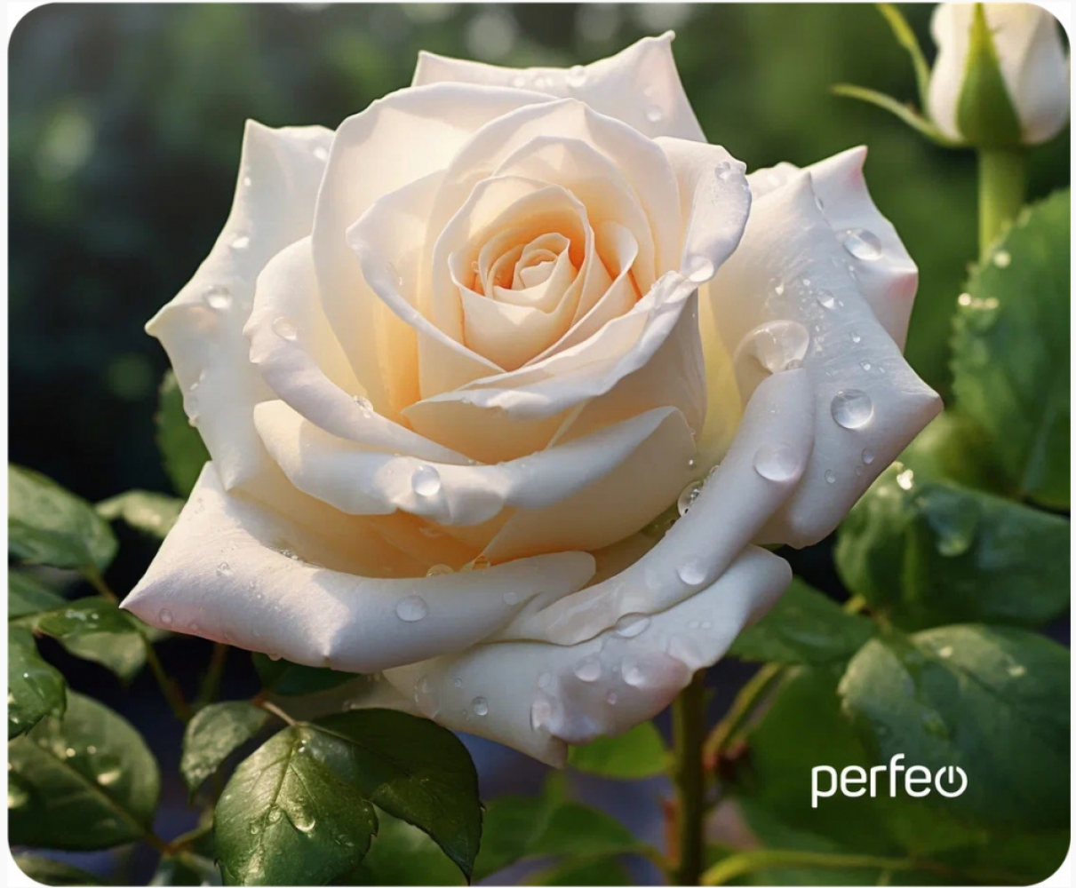 - Уникальный дизайн: принт розы в бело-кремовых тонах с эффектом капель воды
