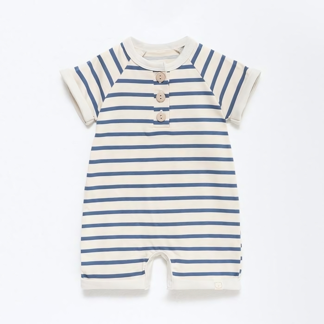 Подарите своему малышу комфорт и свободу движений с этим очаровательным песочником из коллекции "Basic line". Нежный бежевый цвет в сочетании с тонкими синими полосками создаст милый и стильный образ. Идеальный выбор для теплых летних дней!
