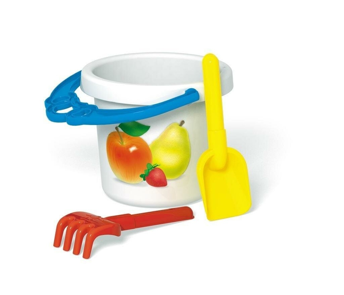 Ведерко белого цвета с синей ручкой украшено изображениями фруктов, что делает его привлекательным для детей. Совок и грабли имеют яркие цвета: желтый и красный соответственно, что добавляет яркости в игру. Размеры совка и граблей идеально подходят для детских рук, что обеспечивает комфортное использование. Песочный набор №122 — это не просто игрушка, а целый мир для творчества и веселья!