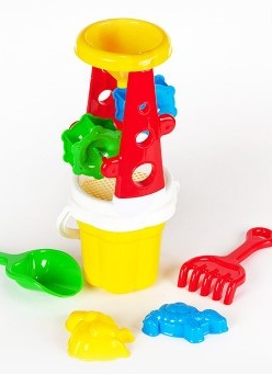 - Яркое ведро с надежной ручкой для переноски песка и воды;