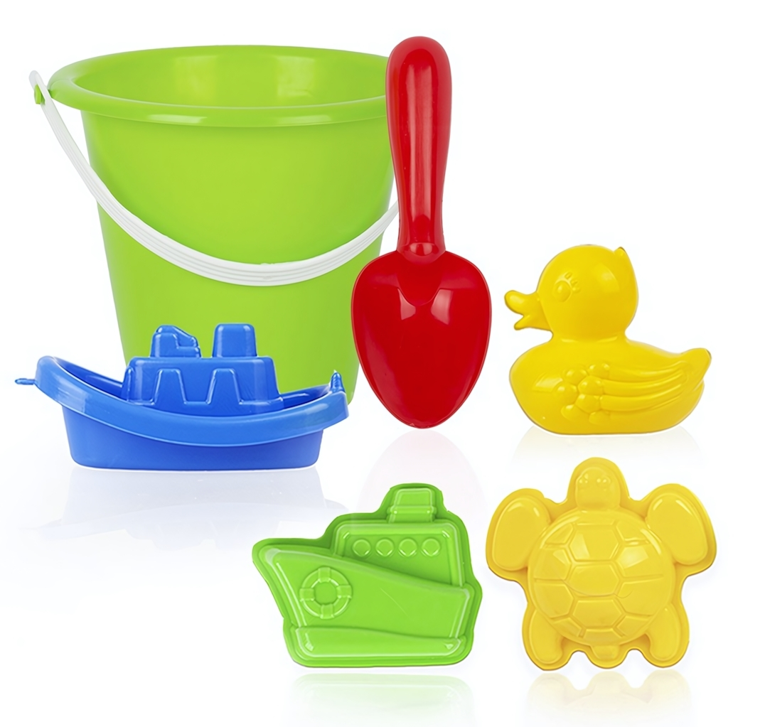 - Яркие цвета: зелёное ведро, красный совок, синие и жёлтые фигурки