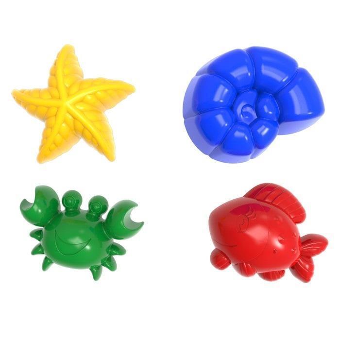 В набор входят 4 формочки в виде морских животных: звезда, рак, ракушка и краб. Все элементы изготовлены из прочного пластика, устойчивого к воздействию солнечных лучей и влаги. Набор упакован в удобную сетку для хранения и переноски.