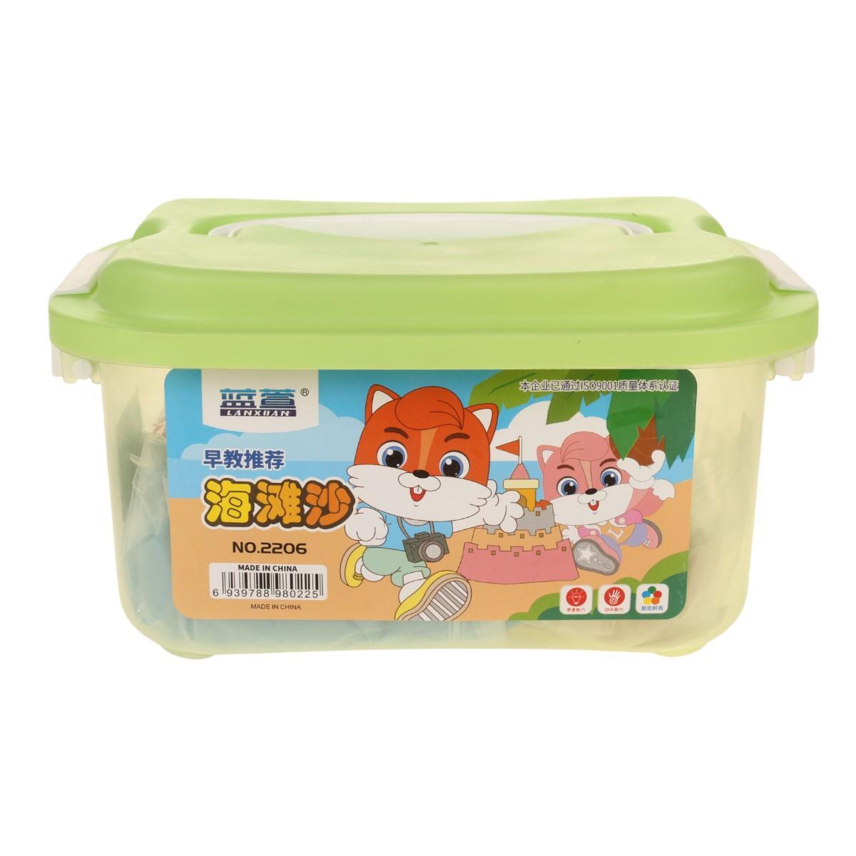 Пластиковый контейнер с удобной ручкой для переноски, 500 г кинетического песка натуральных оттенков и 8 формочек разной геометрии. Все элементы изготовлены из прочного пластика без острых краёв.