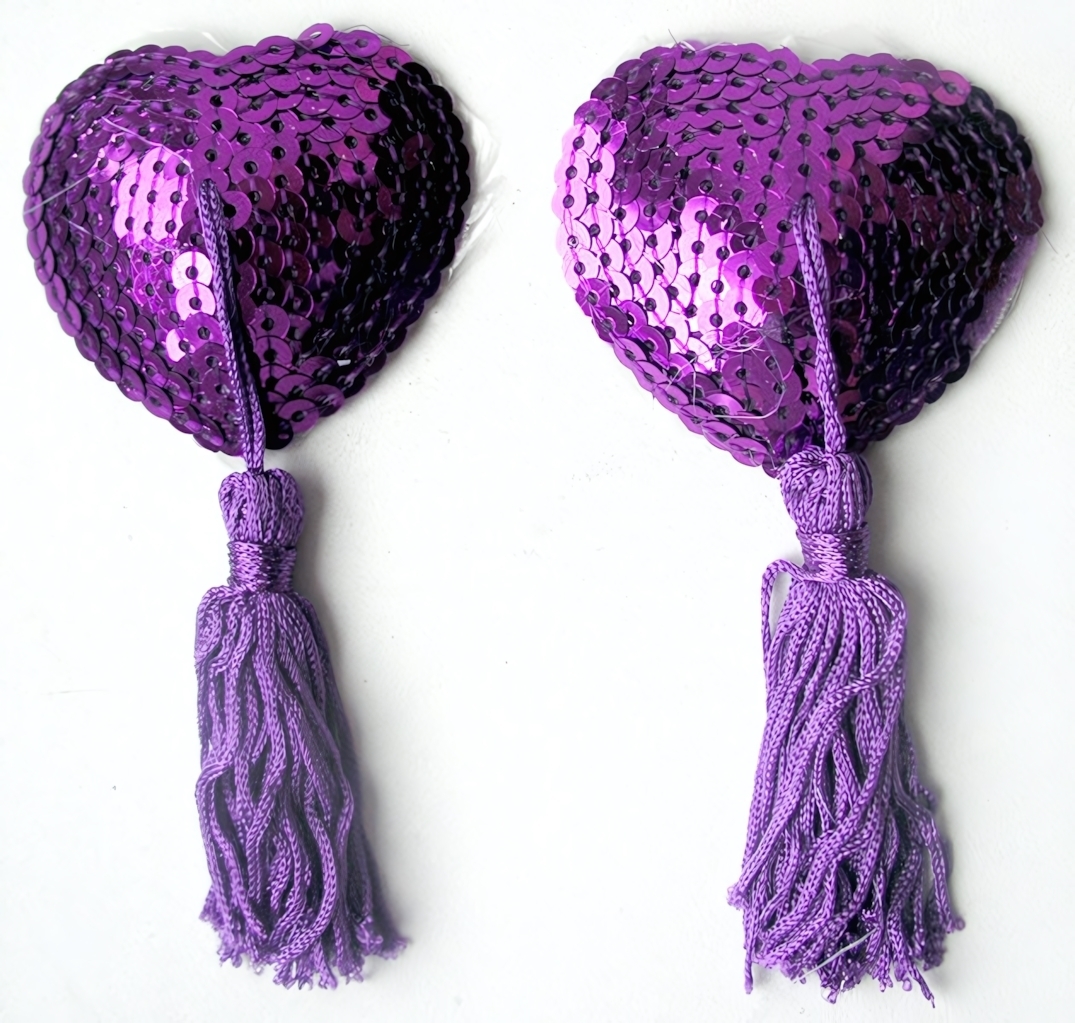 Пэстисы в форме сердец с кисточками, фиолетовые, силиконовая фиксация, пайетки