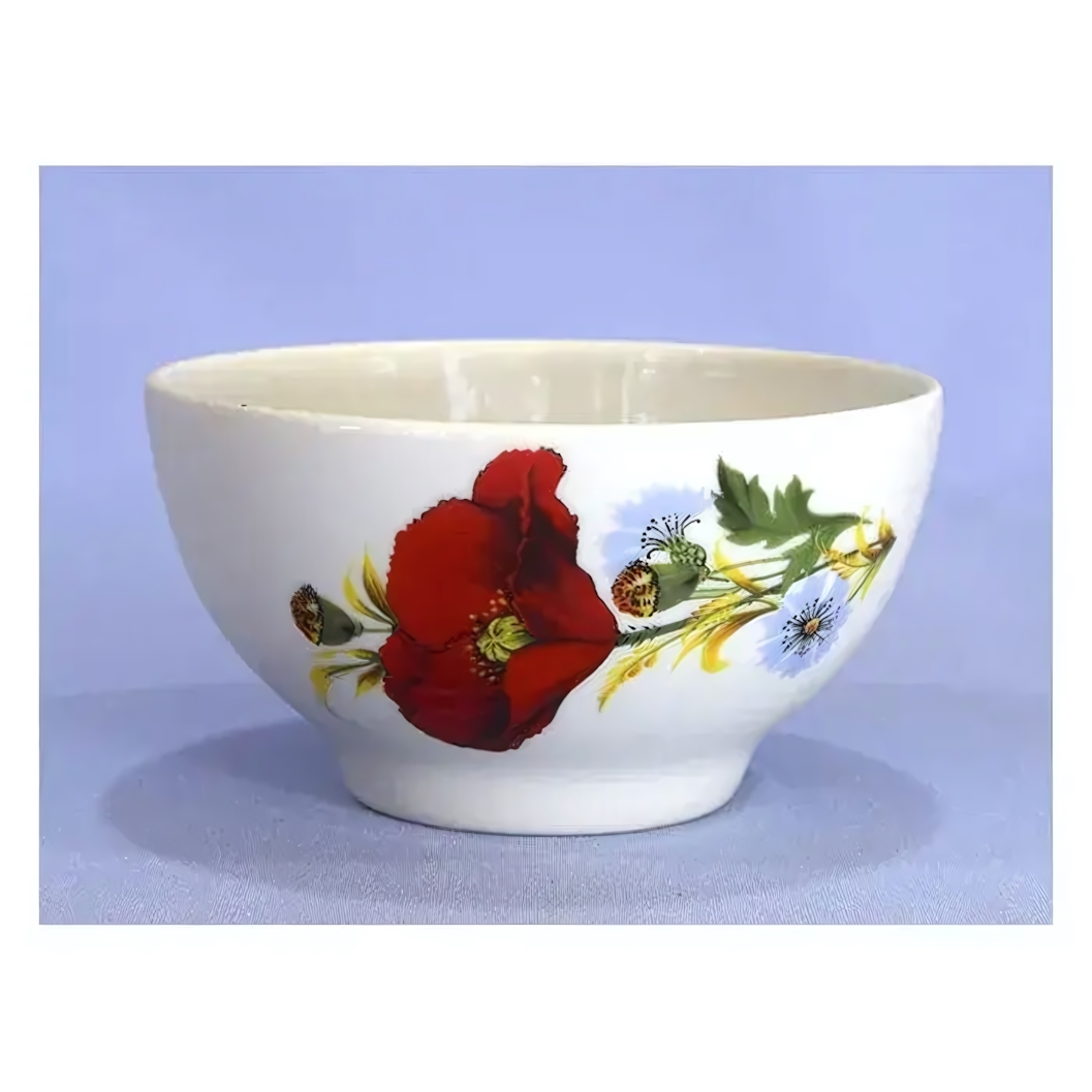 Округлая фарфоровая пиала объемом 250 мл с ярким рисунком маков и голубых цветов — отличный выбор для тех, кто ценит красивую и практичную посуду. Белоснежная основа и живописный декор дарят ощущение свежести на вашем столе, а форма удобна для использования в повседневной жизни и особых случаях.