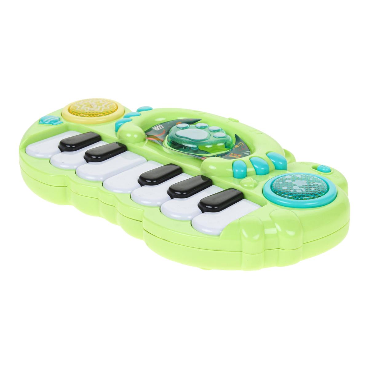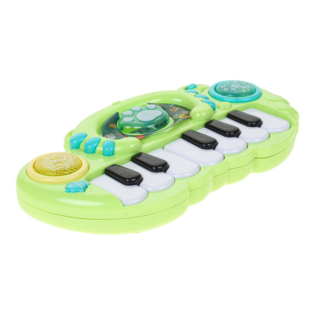 Инструмент оснащен 13 клавишами и дополнительными кнопками, которые активируют звуковые и световые эффекты. Во время игры ребенок развивает слуховое восприятие, чувство ритма и такта, тренирует мелкую моторику и координацию движений. Нажимая на клавиши и элементы управления, малыш учится устанавливать причинно-следственные связи и проявляет творческое воображение.
