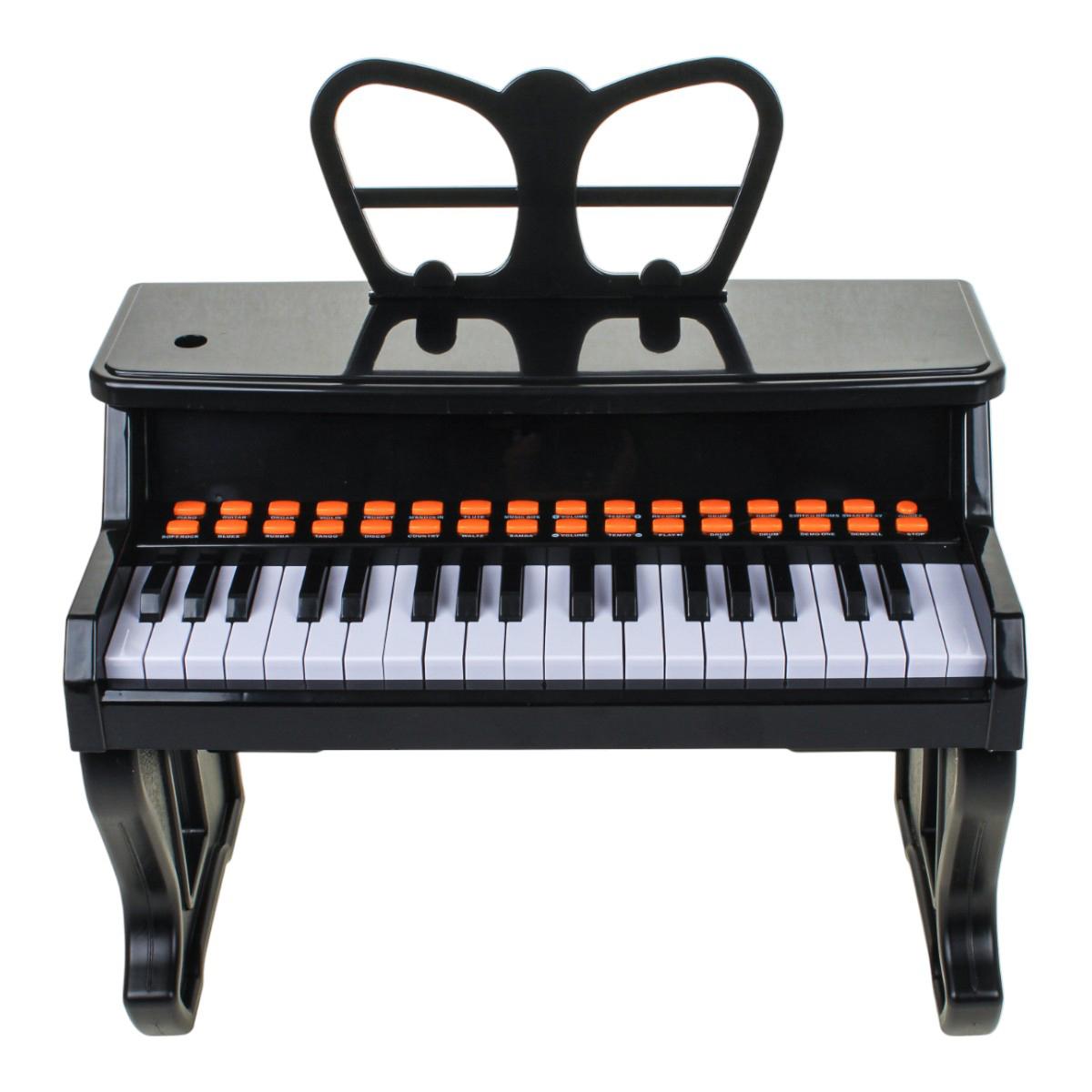 Игрушка оснащена миниатюрной клавиатурой с черными и белыми клавишами, что делает игру удобной даже для маленьких рук. Над клавиатурой расположен ряд элементов (кнопок), которые могут добавлять разнообразия в звучание. Пианино работает на батарейках, что делает его мобильным и позволяет играть в любом месте. Элегантный дизайн с фигурной спинкой в виде пюпитра добавляет сходства с настоящим инструментом.