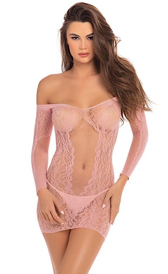 Платье эротическое мини, размер S-M, цвет нежно-розовый, сетка с кружевом