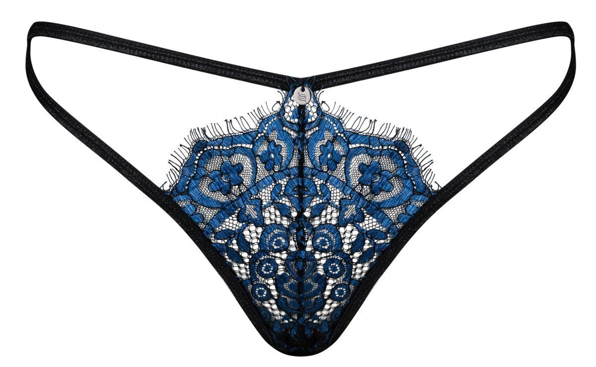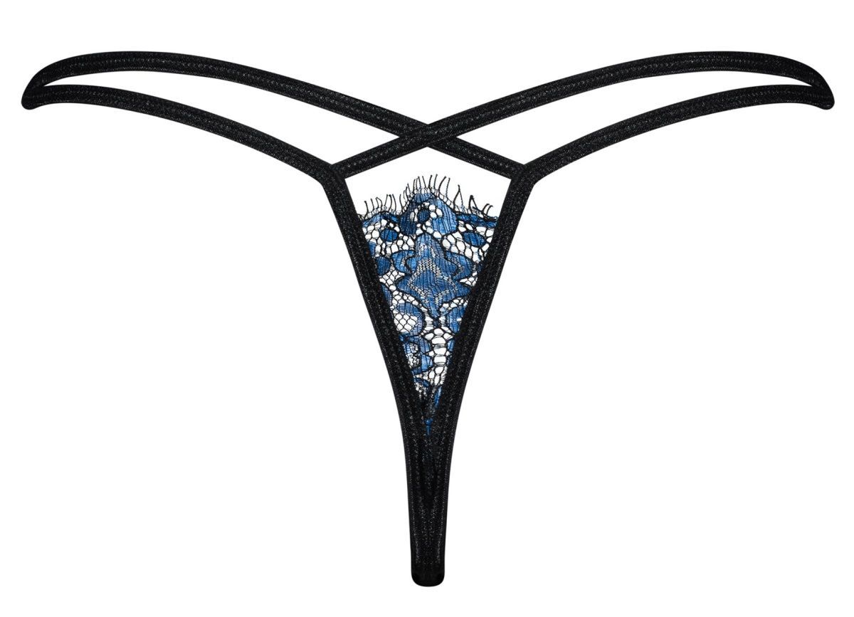 Трусики-стринги «Yassmyne», черные с синим кружевом, размер S-M, комфортная посадка