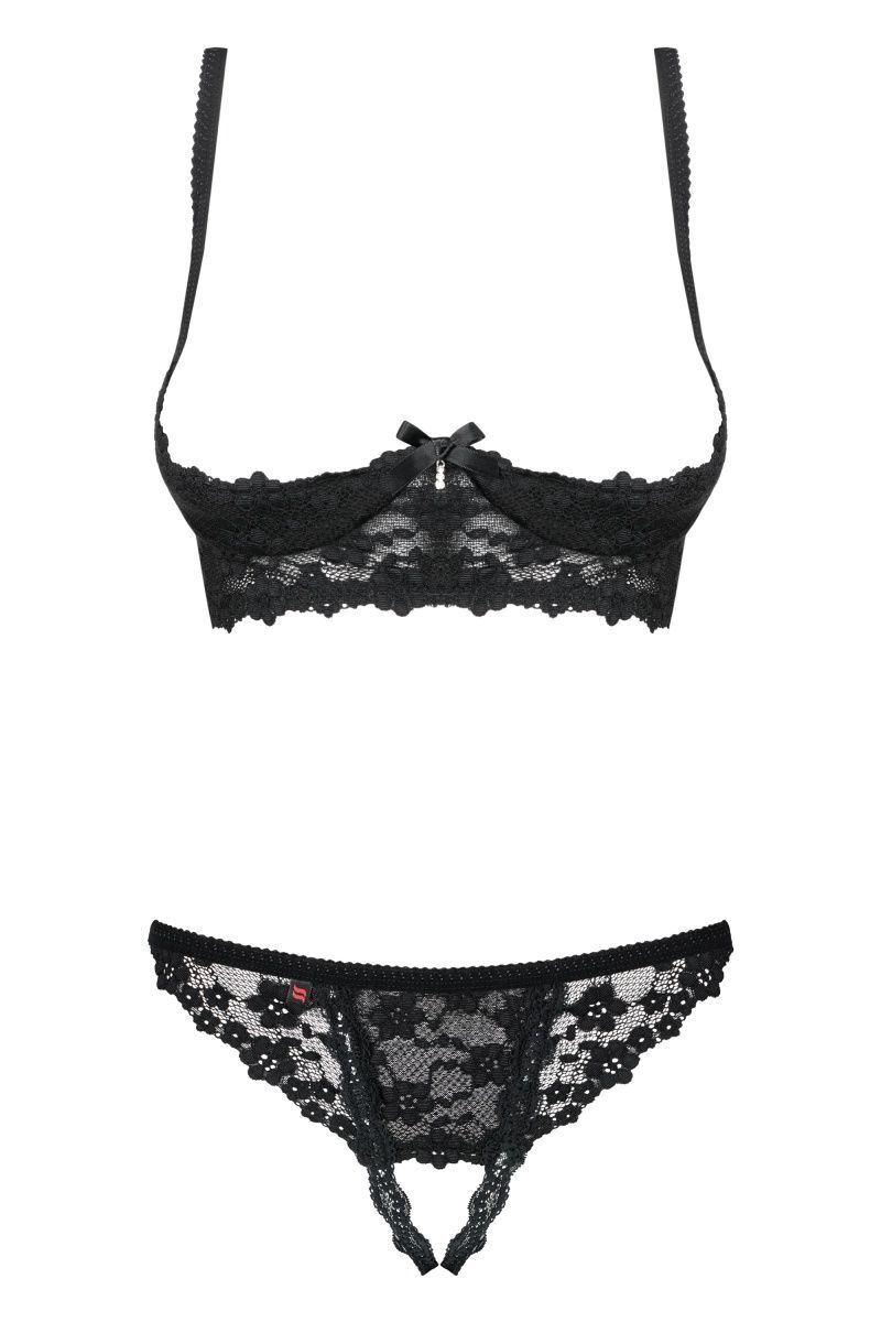 Комплект состоит из бюстгальтера с открытыми формованными чашечками и трусиков-стрингов. Бюстгальтер обеспечивает великолепную поддержку благодаря косточкам и регулируемым бретелям, что позволяет вам настроить его под себя. Застежка на крючки сзади обеспечивает надежную фиксацию. Трусики-стринги с открытой промежностью добавляют дополнительную пикантность и сексуальность вашему образу.
