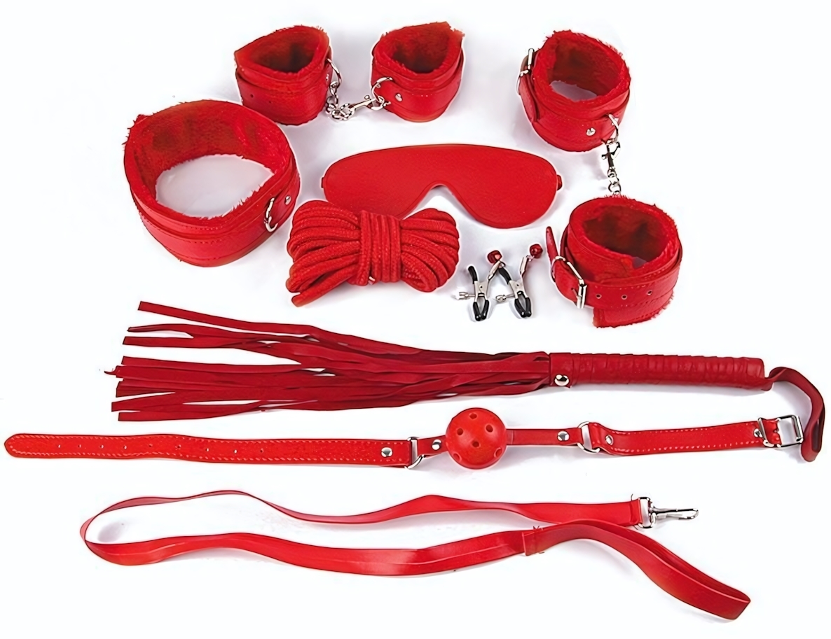 Красный цвет комплекта создает психологический эффект — усиливает эмоциональное восприятие игры. Материал сохраняет эластичность при температурах от -10°C до +60°C. Для хранения предусмотрена петля на плети для подвешивания.