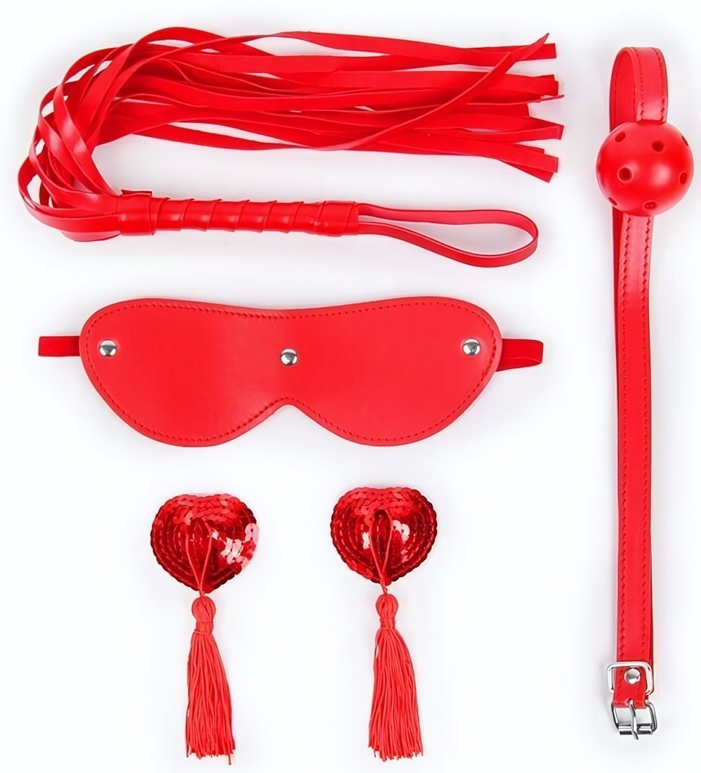 В набор входят плеть, кляп, маска и пэстисы для украшения сосков. Плеть-флогер с длинными хвостами и удобной рукояткой позволяет легко управлять процессом, а кляп с шариком и отверстиями для дыхания обеспечивает комфорт и безопасность. Маска закрывает глаза, создавая эффект загадки, а пэстисы добавляют игривости и эстетики. Этот набор идеально подходит как для новичков, так и для опытных любителей БДСМ-игр.