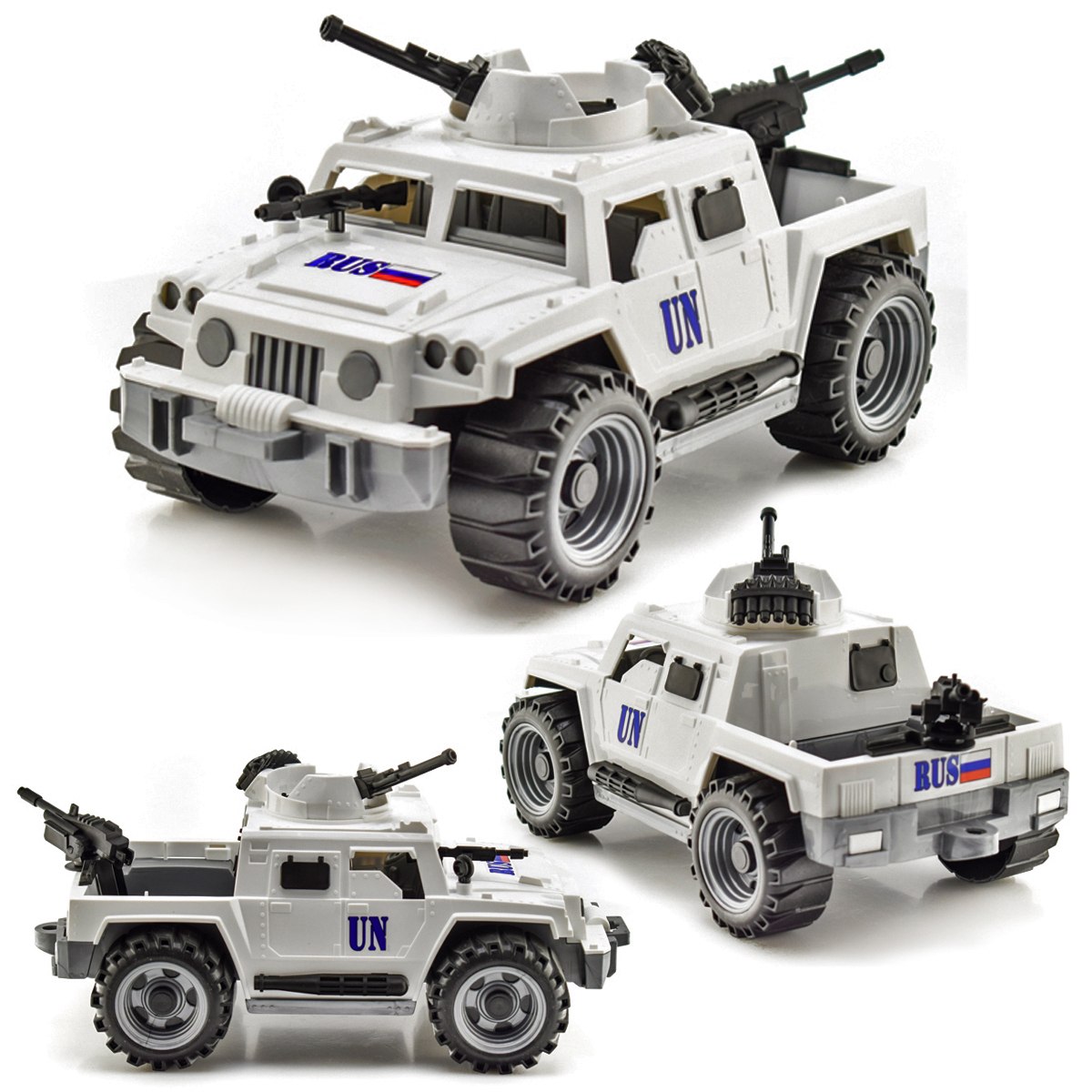 Размер пикапа составляет 31,5 см в длину, 16 см в ширину и 14 см в высоту. Он выполнен в белом цвете с черными колесами и деталями, что придает ему стильный и агрессивный вид. Игрушка имеет маркировки "RUS" и "UN", что добавляет ей аутентичности. Пикап "Миротворец" — это не просто игрушка, а целый мир приключений для вашего ребенка!