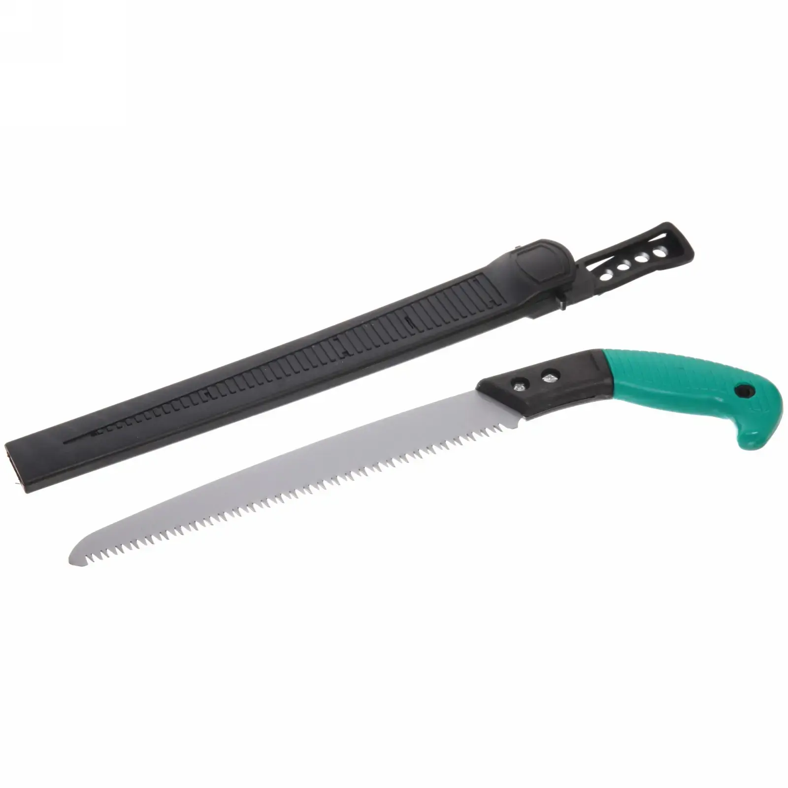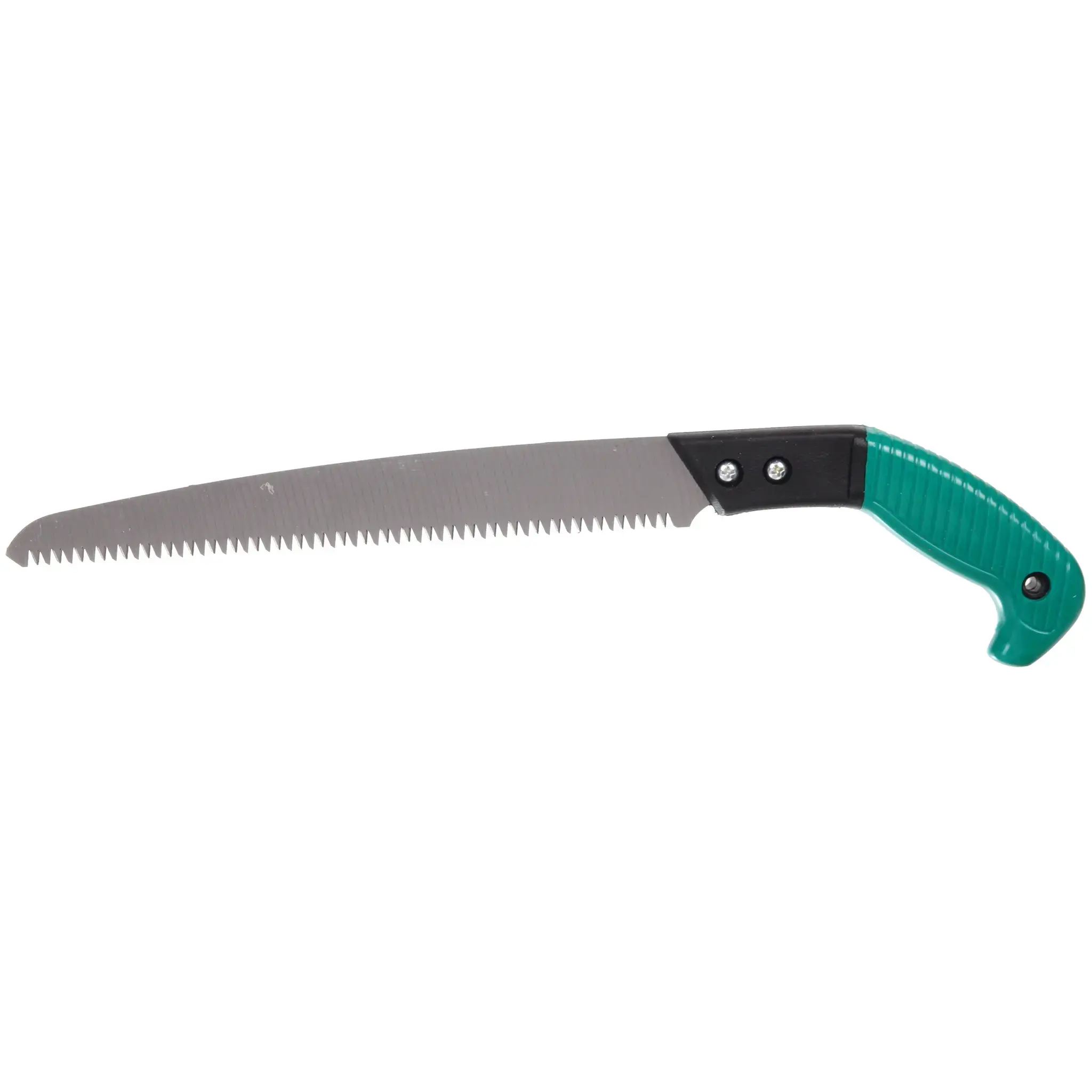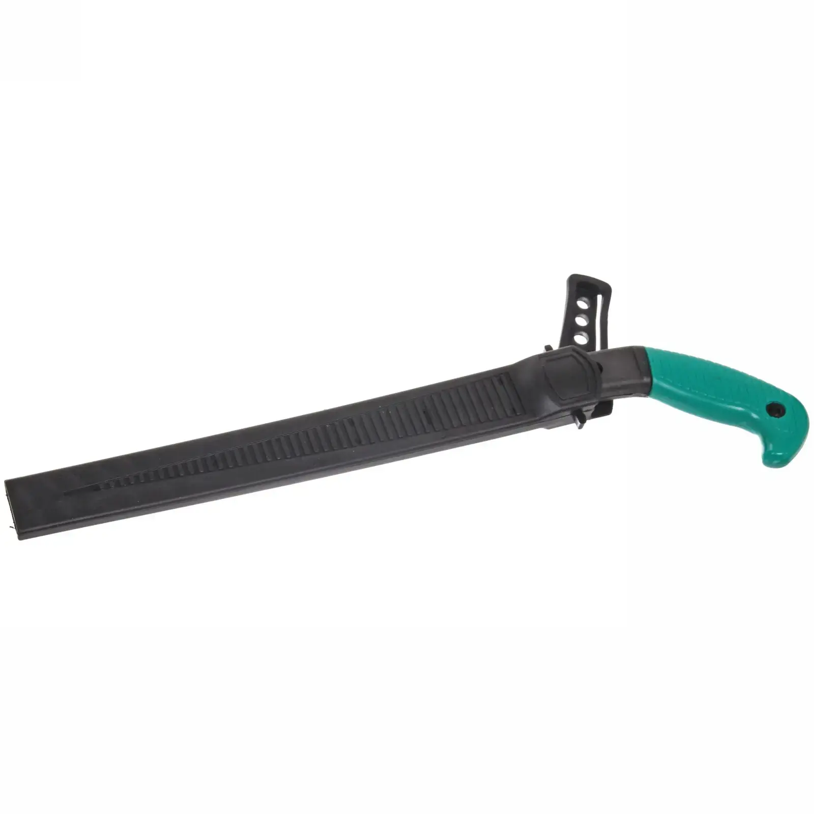 Длина лезвия составляет 27 см, что делает пилу компактной и удобной для транспортировки. Материалы, из которых изготовлена пила, включают металл и пластик, что обеспечивает легкость и прочность конструкции. Пила имеет зеленую рукоятку, что делает её стильной и легко заметной в траве или на земле.
