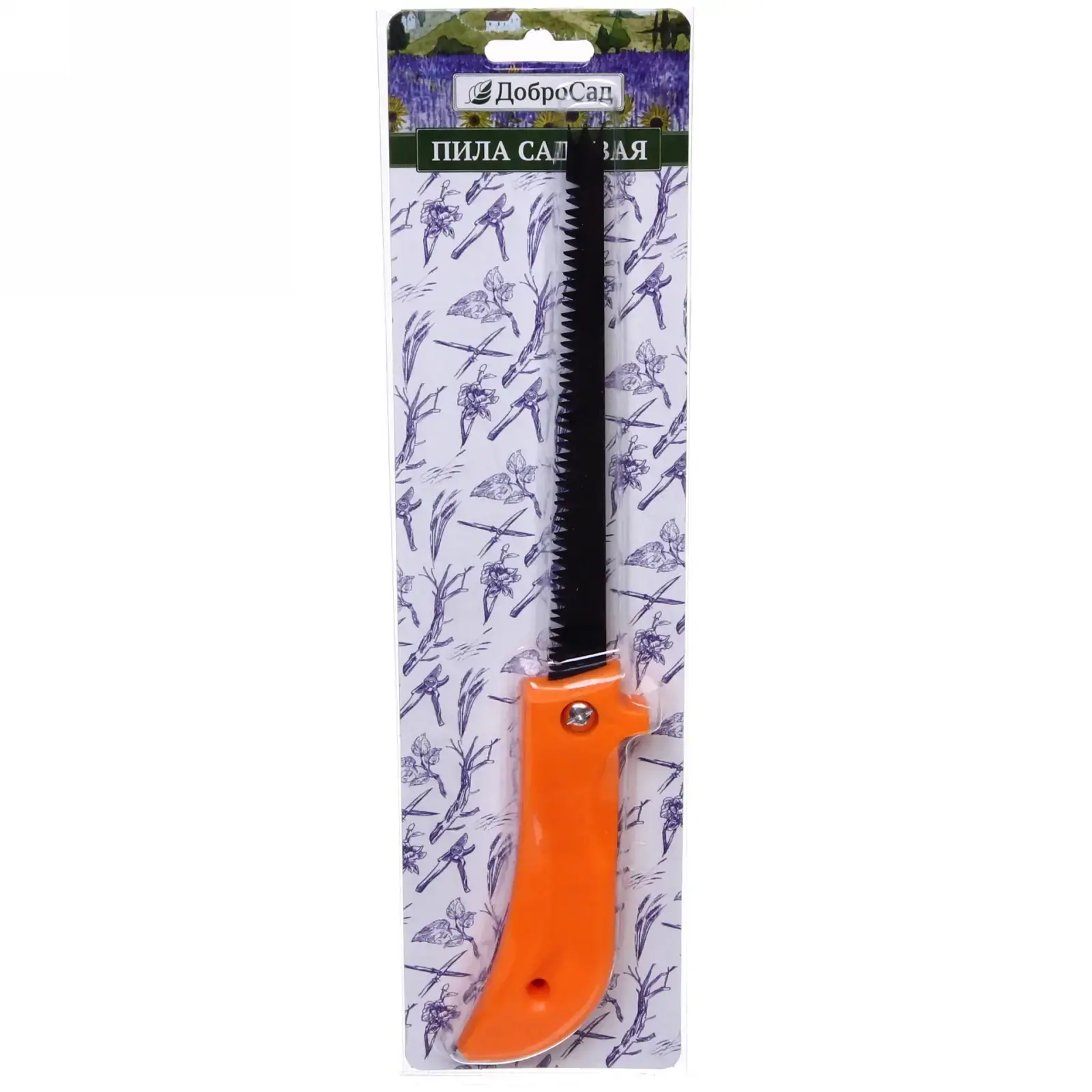 Пила выполнена из качественных материалов: металл и пластик, что обеспечивает ее долговечность и устойчивость к износу. Длина полотна составляет 30 см, что является стандартным размером для садовых инструментов. Яркая оранжевая ручка не только привлекает внимание, но и обеспечивает комфортный захват, что позволяет работать долго без усталости.
