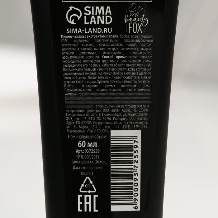 Объем упаковки составляет 60 мл, что делает продукт удобным для использования в домашних условиях. Упаковка выполнена в стильном черном цвете с минималистичным дизайном, что добавляет элегантности вашему уходу за лицом. Пилинг-скатка произведена в России и соответствует всем стандартам качества.