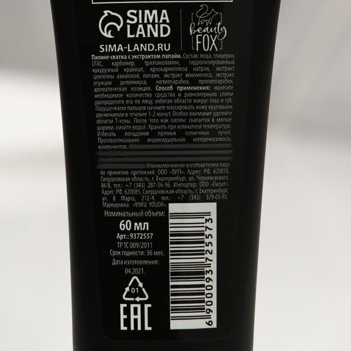 Объём тубы составляет 60 мл, что делает её удобной для использования как дома, так и в поездках. Упаковка выполнена в стильном черном цвете с яркими иллюстрациями, что добавляет эстетики вашему косметическому арсеналу. Пилинг-скатка имеет гладкую текстуру и легко наносится, обеспечивая комфортное использование.