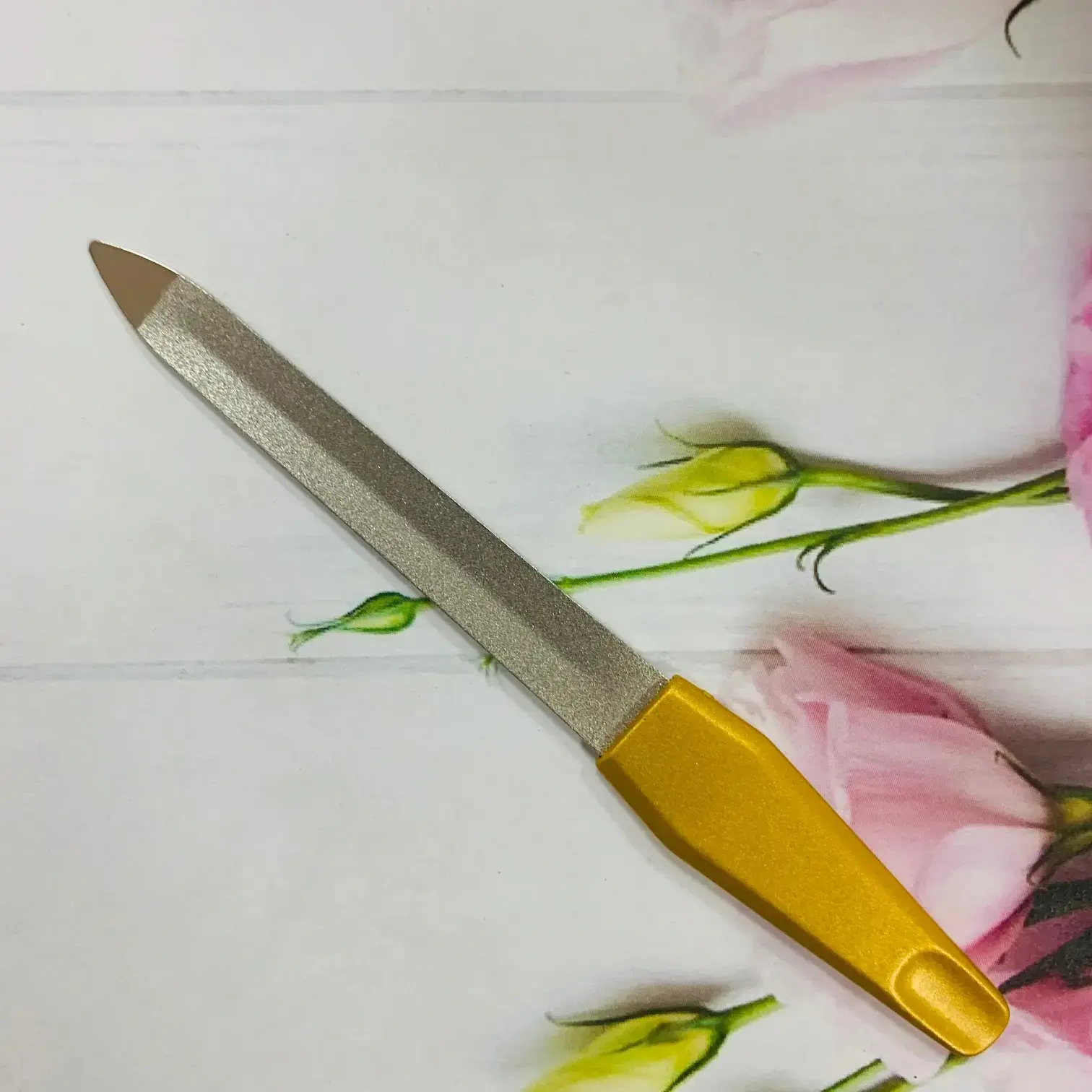 Пилка для ногтей металлическая Ultramarine — это ваш надежный помощник в создании идеального маникюра. С её помощью вы сможете быстро и эффективно корректировать длину и форму натуральных ногтей, а также обрабатывать кожу вокруг них. Благодаря элегантному дизайну с золотистой ручкой, этот инструмент не только функционален, но и станет стильным дополнением вашего набора для маникюра.