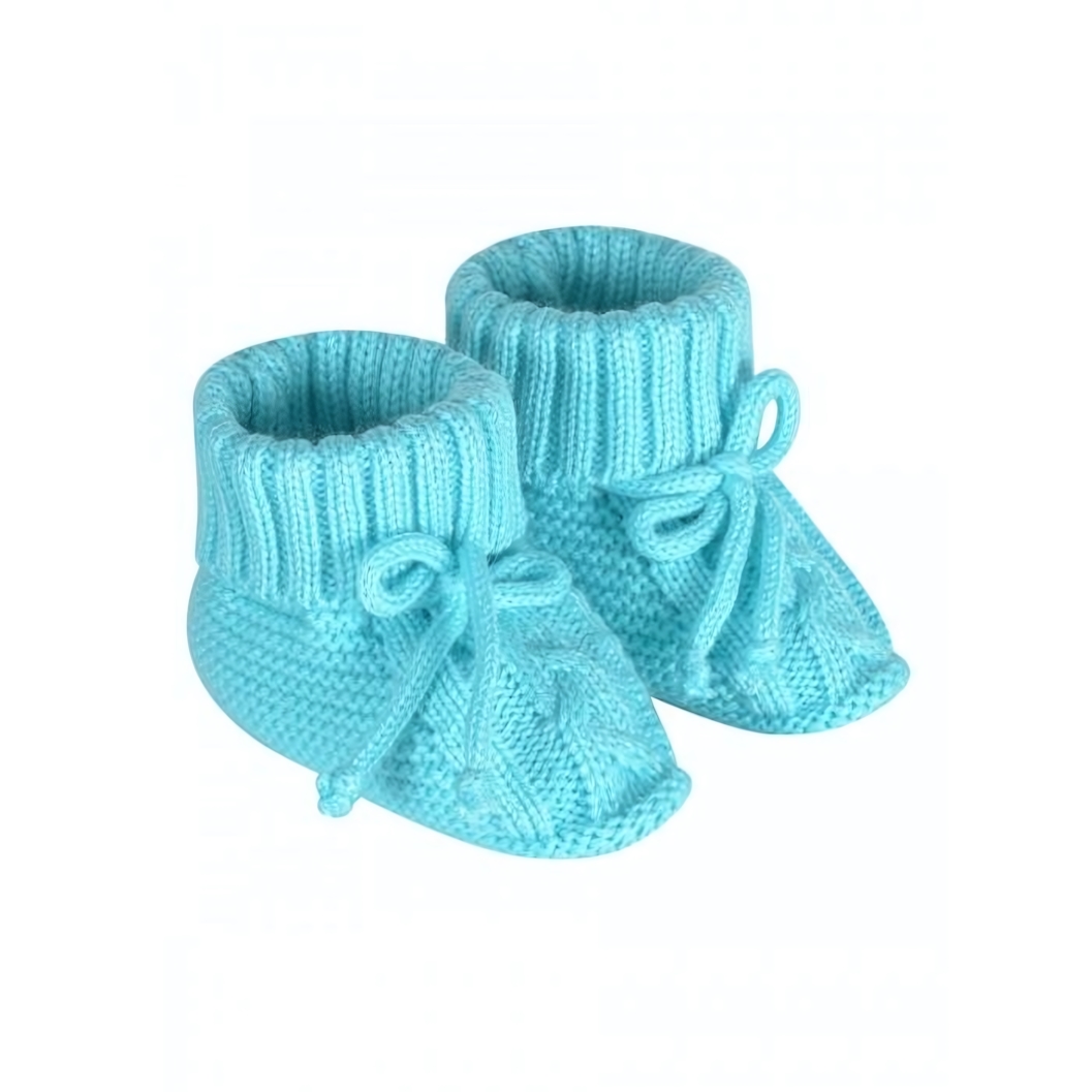 Мягкие вязаные пинетки бирюзового цвета станут идеальным выбором для первых шагов маленьких ножек. Эластичные манжеты и удобные завязки обеспечивают надежную фиксацию, сохраняя тепло и комфорт в течение всего дня.