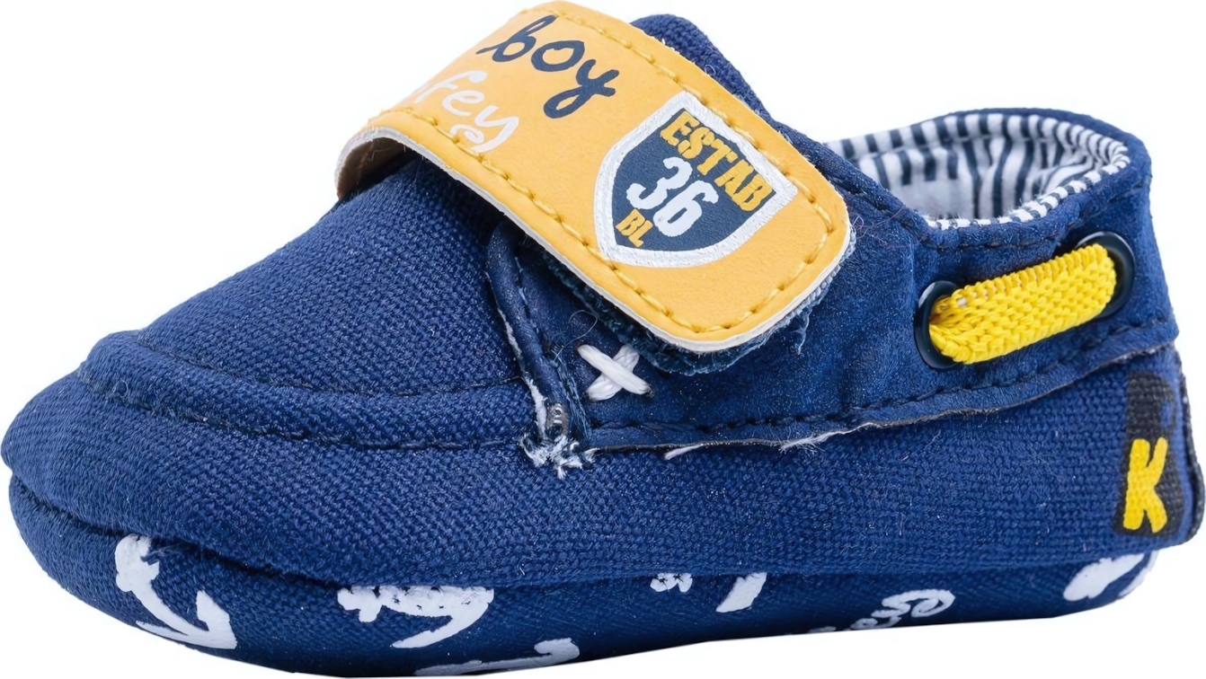 Пинетки изготовлены из высококачественного текстиля темно-синего цвета с яркими акцентами желтого цвета. Декоративные элементы в виде якорей и надписей добавляют изделию стильный вид.