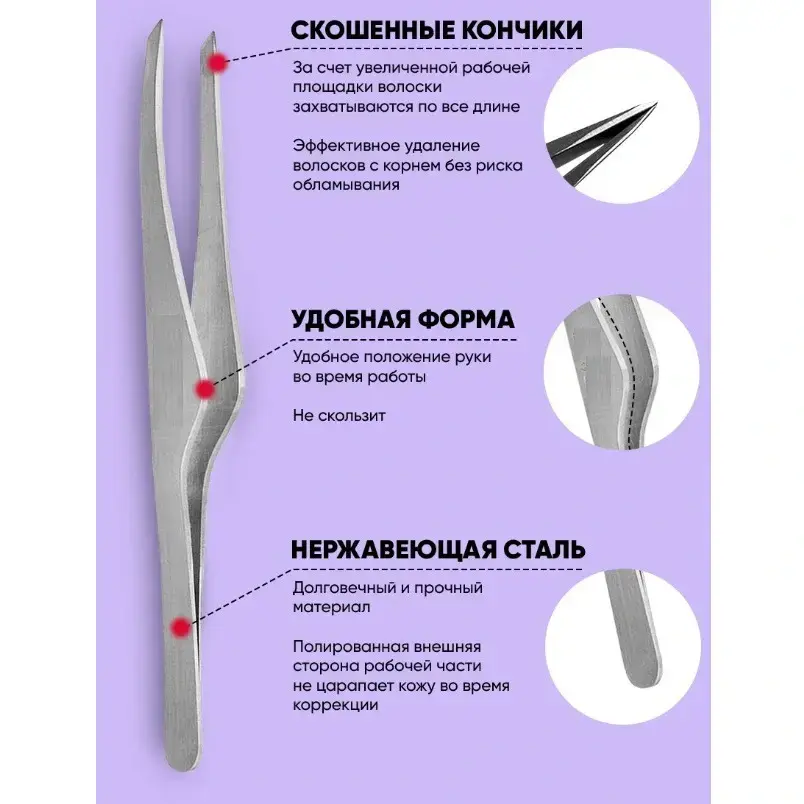 Преимущества данного пинцета заключаются в его долговечности и надежности. Изготовленный из нержавеющей стали, он не подвержен коррозии и сохраняет свои свойства на протяжении долгого времени. Скошенные кончики обеспечивают точное захватывание волосков, что делает процесс удаления быстрым и эффективным.