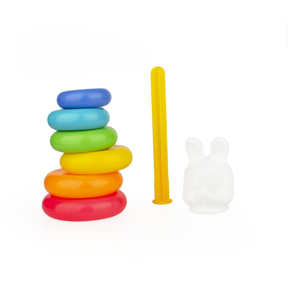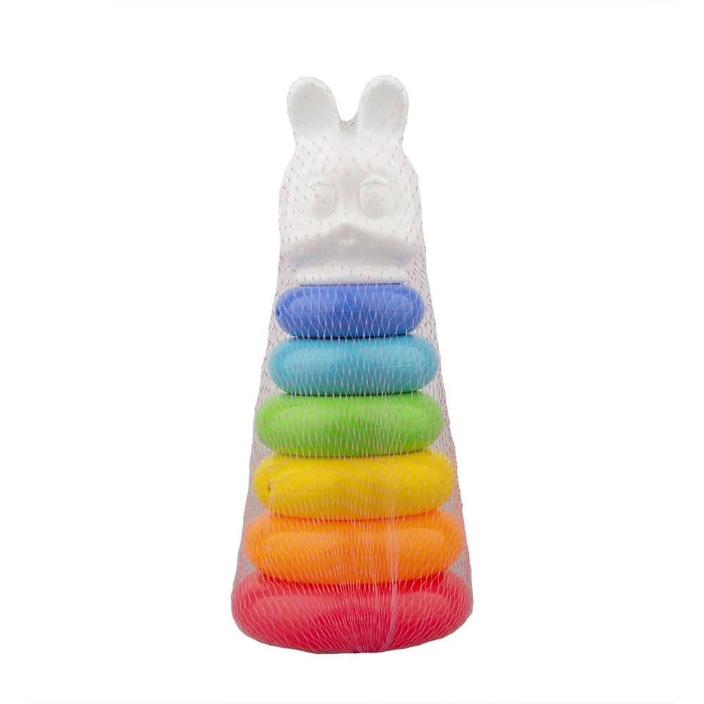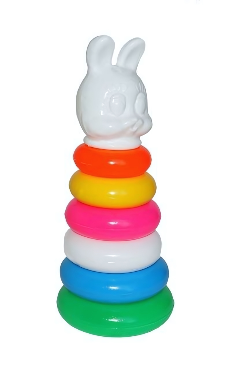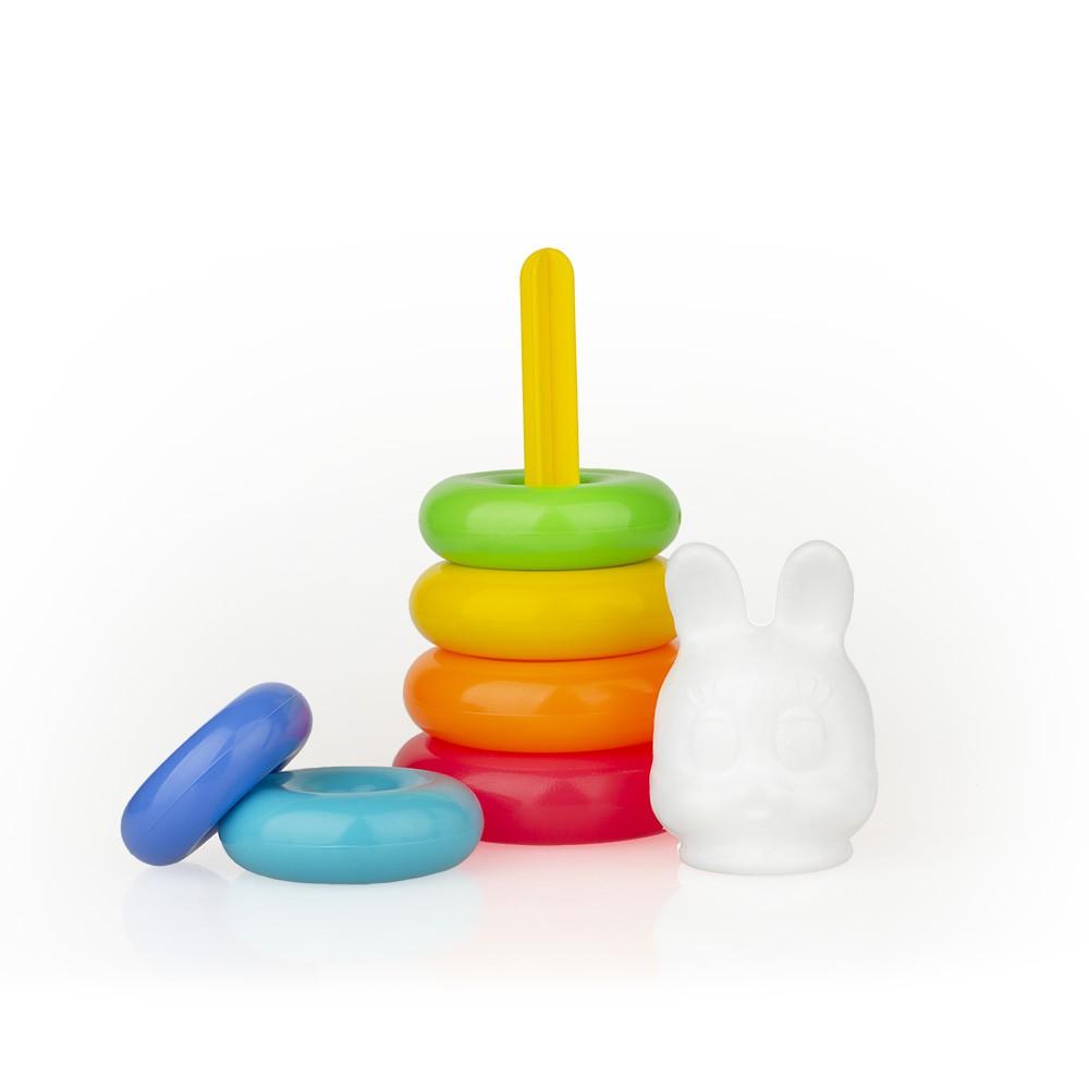 Игрушка состоит из 6 разноцветных колец и верхней фигурки в виде зайца, что стимулирует восприятие цветов и форм. Конструкция легкая и удобная для малышей, способствует развитию координации движений и навыков сортировки. Высота изделия 24 см, диаметр нижнего кольца 10,5 см – оптимальные размеры для маленьких ручек.