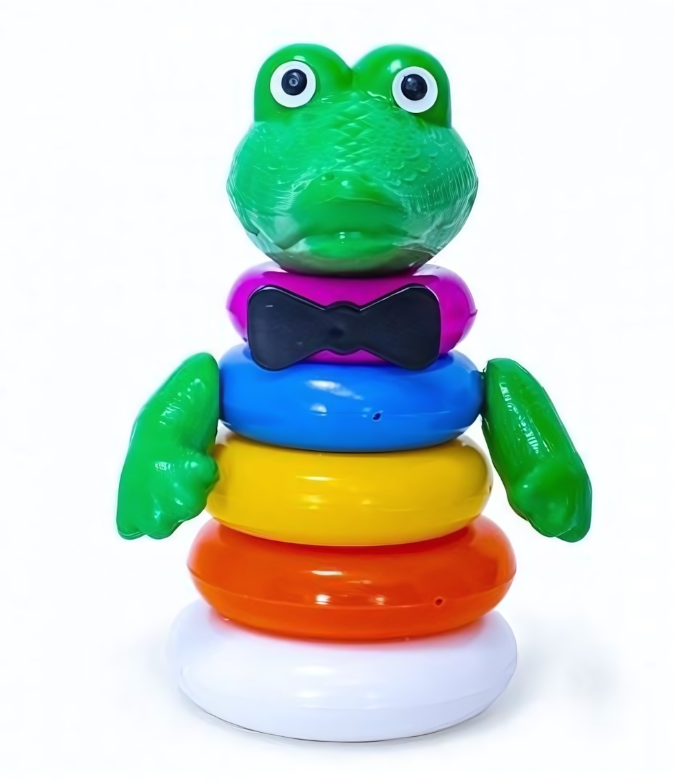 Пирамидка состоит из 5 колец разного диаметра и оттенков, которые последовательно нанизываются на центральную ось. Яркая голова крокодила завершает композицию и придает игрушке неповторимый характер.