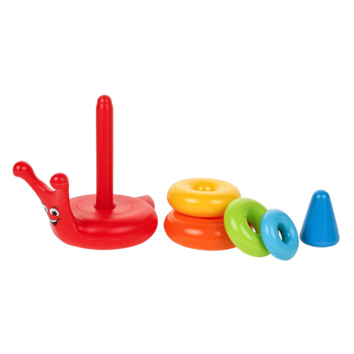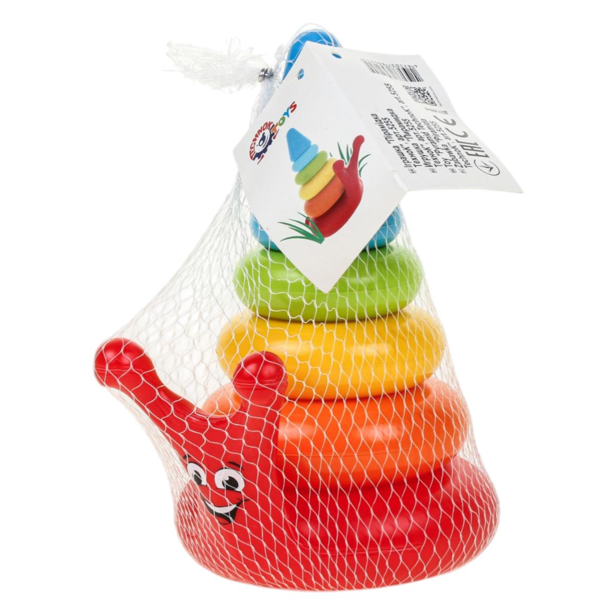 Основание игрушки выполнено в виде симпатичной улитки с доброй улыбкой и изогнутым дном. Такая конструкция позволяет игрушке забавно покачиваться, привлекая внимание малыша и стимулируя его к активным действиям. На прочный центральный стержень нанизываются четыре разноцветных кольца и венчающий конус, формируя гармоничную радужную композицию.