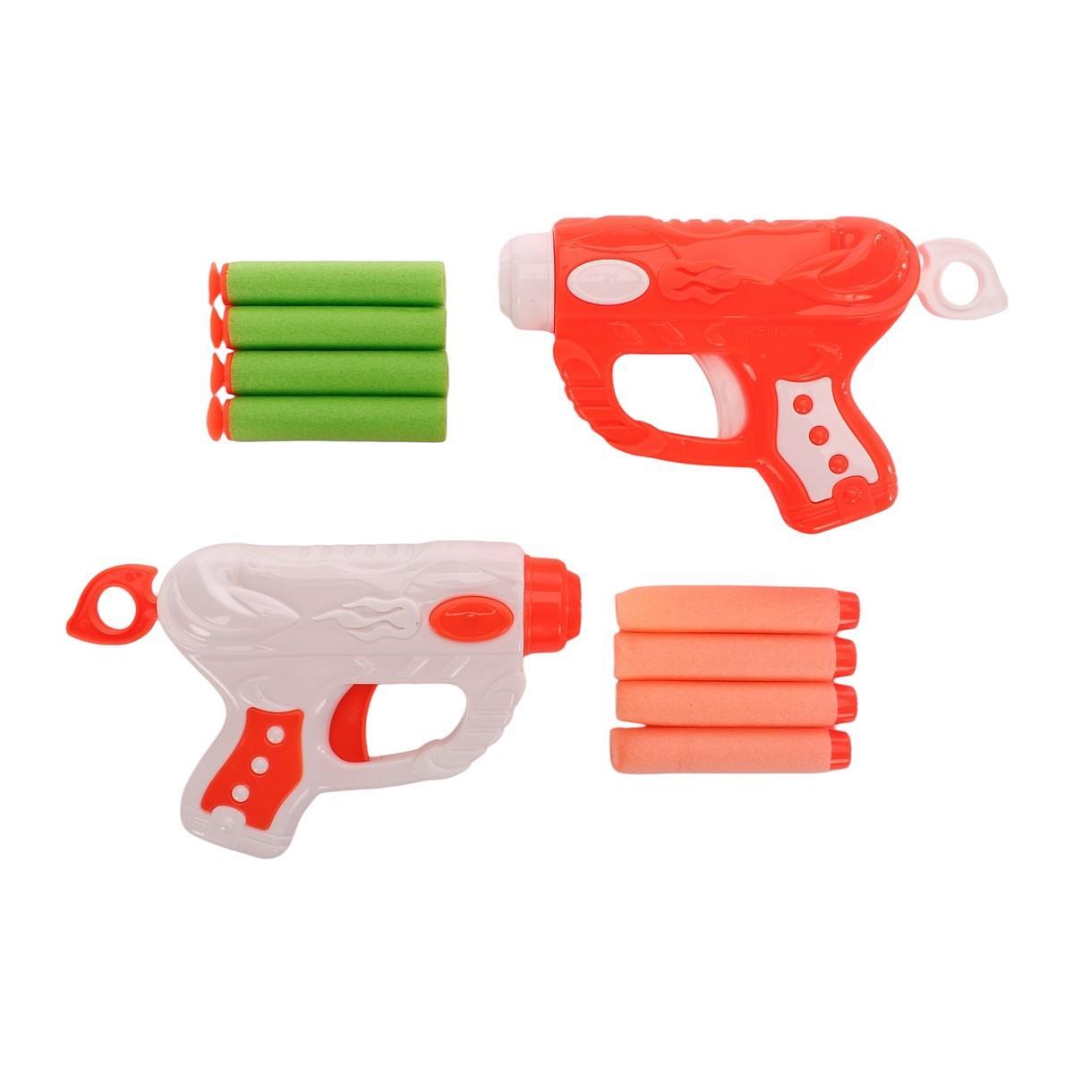 Размеры каждого пистолета: примерно 20х12х4 см, материал: прочный пластик, с мягк.пулями 8 шт. в комплекте.