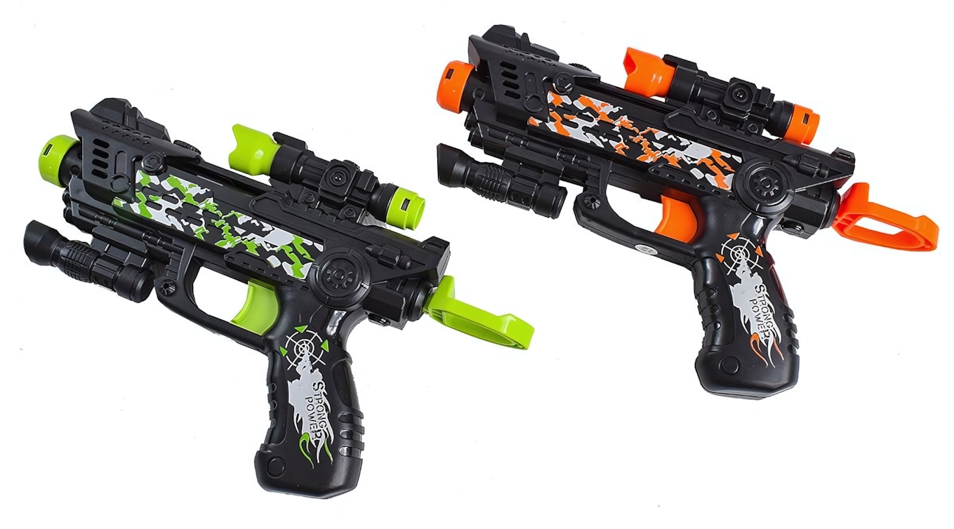 - 2 игрушечных пистолета с пружинным механизмом (чёрный цвет с камуфляжным рисунком и цветными акцентами).