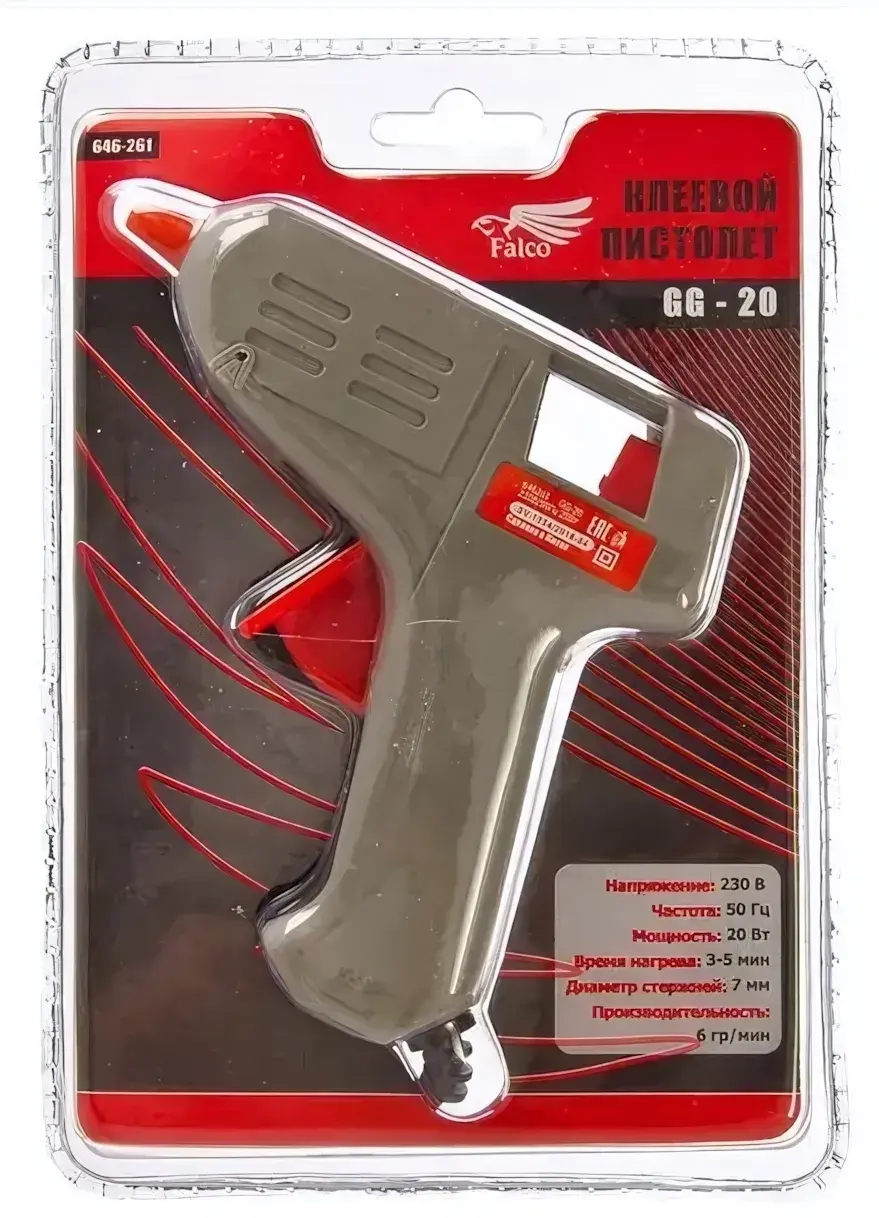 Клеевой пистолет Falco GG-20, 20Вт, быстрый нагрев за 3-5 мин, диаметр 7мм, 2 стержня в комплекте