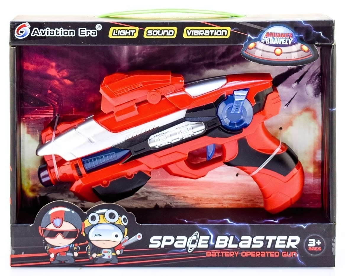 Красно-серебристый дизайн с элементами черного и синего цветов отлично передает футуристический стиль космического оружия. Удобные кнопки управления позволяют ребенку легко активировать все функции.