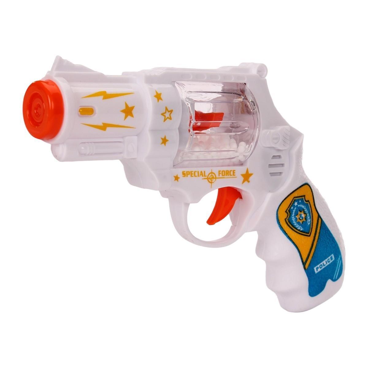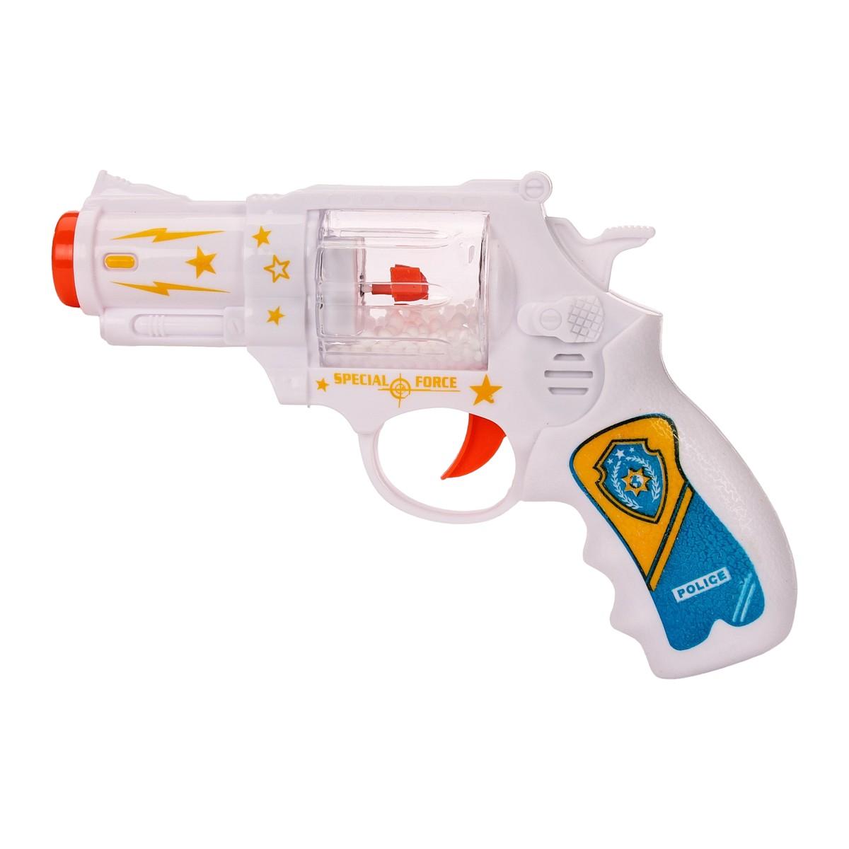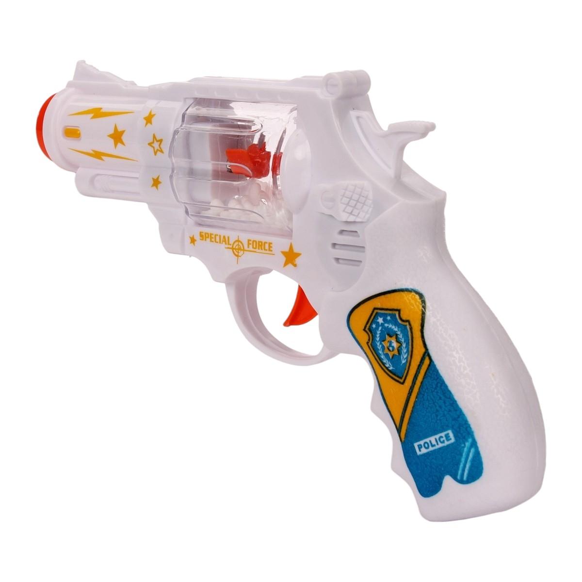 Размер упаковки составляет 19х4х12,5 см, что делает его удобным для хранения и транспортировки. Пистолет выполнен в белом цвете с яркими акцентами, такими как оранжевый курок и синий значок с желтой эмблемой полиции. Он станет отличным подарком для любого ребенка, который любит активные игры и приключения.
