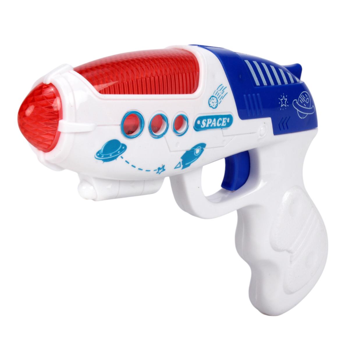 Этот игрушечный пистолет на батарейках — отличный выбор для юных любителей фантастики и приключений. Благодаря яркому дизайну с изображениями планет, звезд и надписью «SPACE», он станет главным аксессуаром в игре и стимулирует воображение ребенка. Продукт выполнен из прочного пластика, что обеспечивает безопасность и долговечность в использовании.