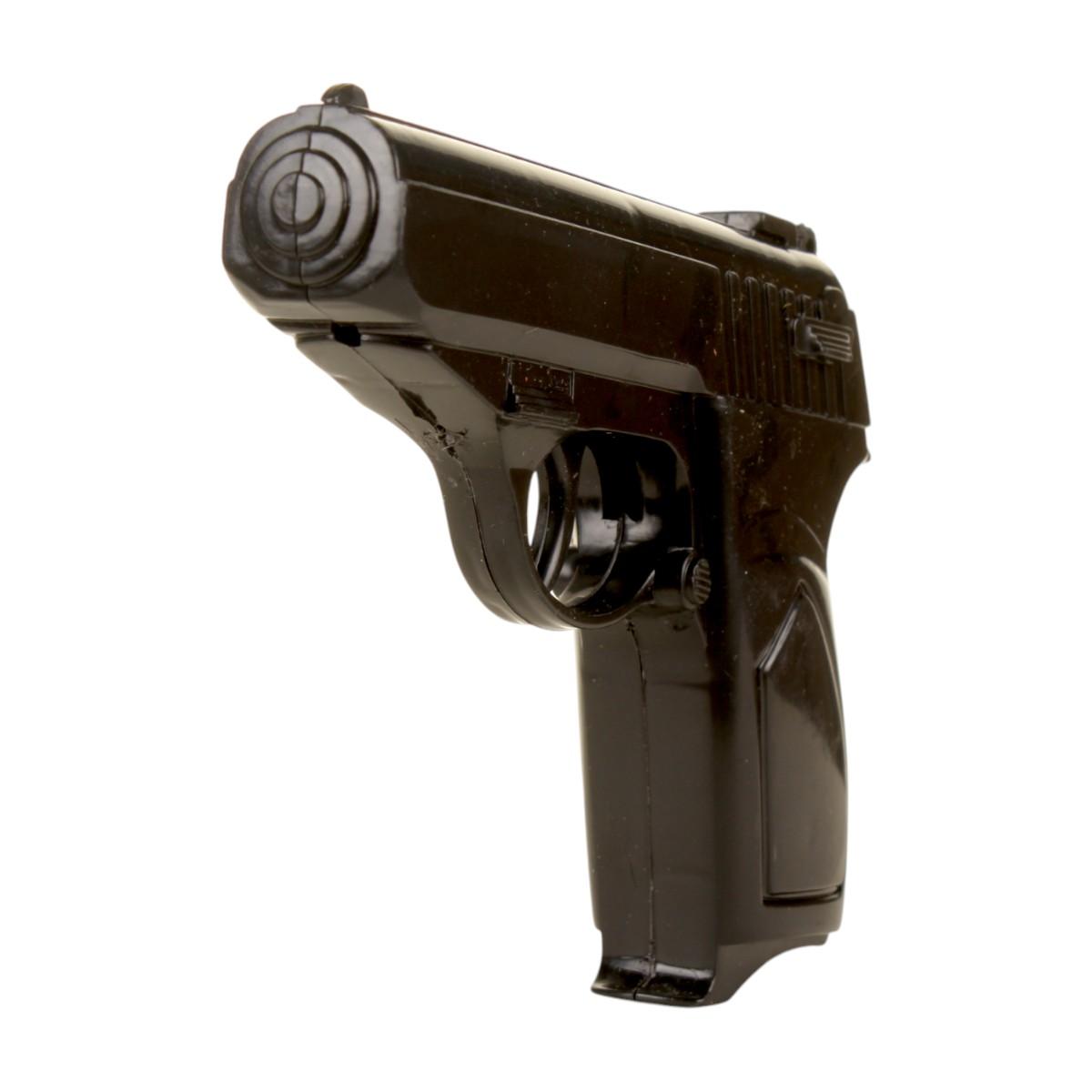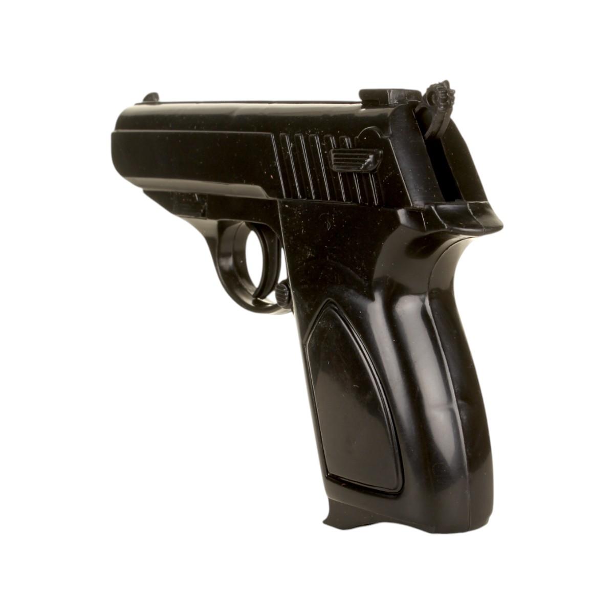 Простой механический принцип действия не требует батареек – спусковой крючок приводит в действие трещотку, имитирующую звуки выстрелов. Размеры 36х9х24 см идеально подходят для детской руки.