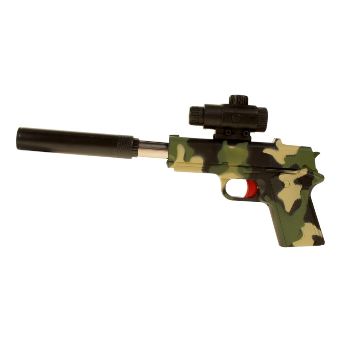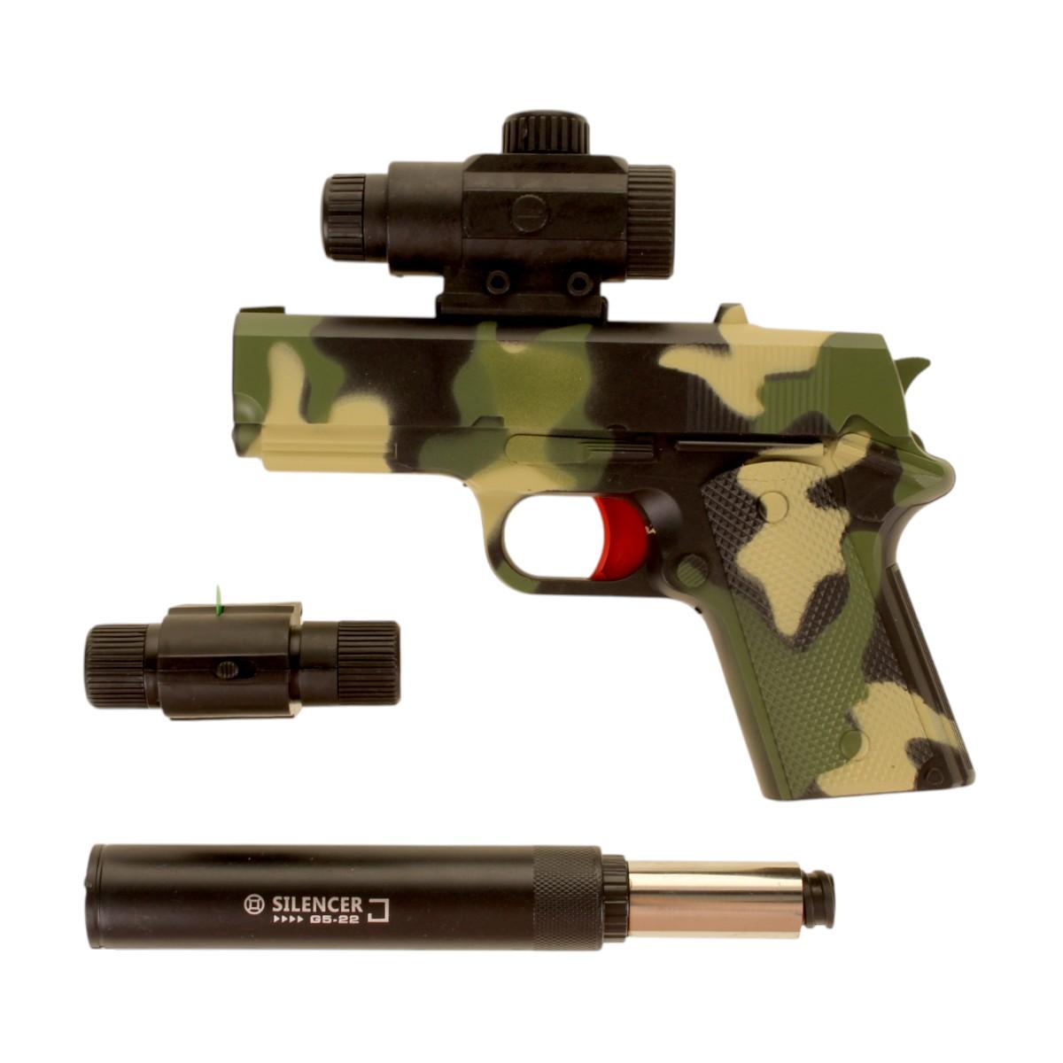 Главные преимущества этого товара — это реалистичный дизайн в камуфляжной окраске, включающий оптический и лазерный прицелы, которые позволяют ребенку моделировать военную или охотничью сцену. Также в комплект входит глушитель с маркировкой 'SILENCER', что добавляет игре элементов реалистичности и интереса. Компактные размеры 29,6х3,0х14,3 см делают пистолет удобным для маленьких рук, а легкая конструкция обеспечивает комфортное пребывание во время активных игр.