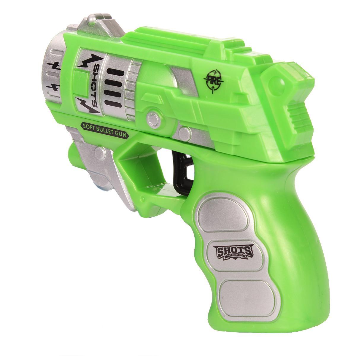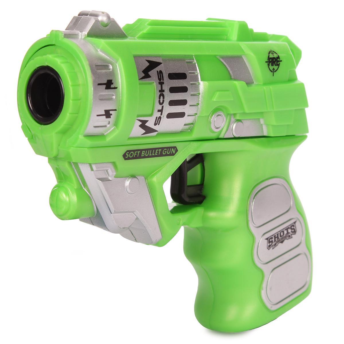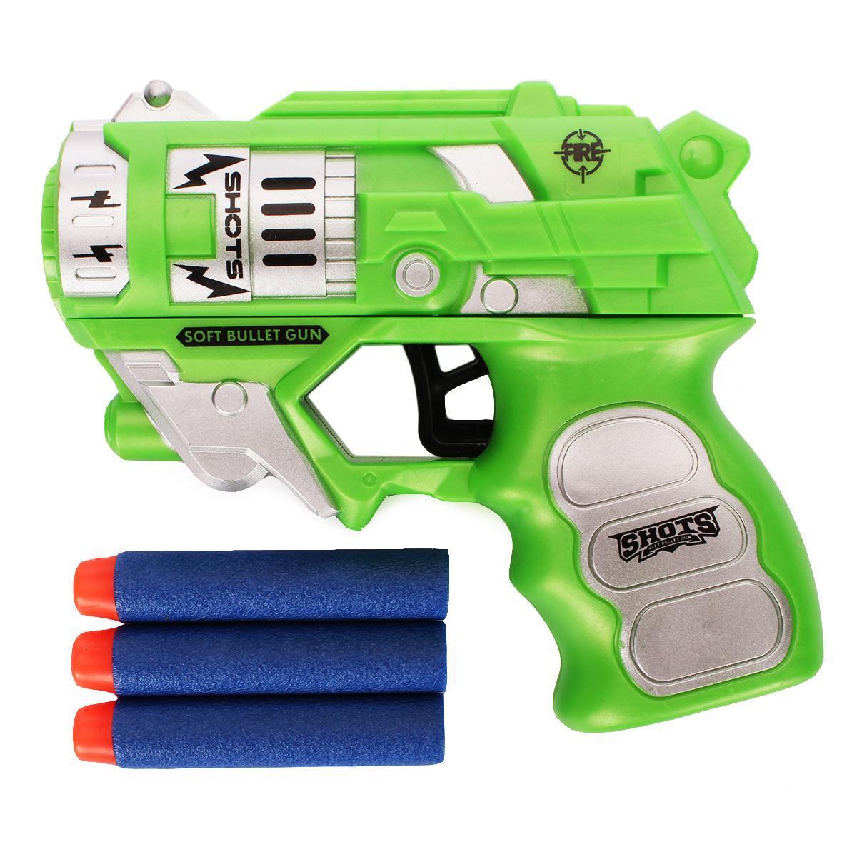Материал: высококачественный пластик; длина: 17 см; в комплекте: пистолет + 3 мягкие патрона (длина каждого патрона — около 7 см). Размер упаковки — 17,5 x 21,5 x 5,5 см, что облегчает хранение и транспортировку. Товар изготовлен в Китае на предприятии Санкт-Петербурга, что гарантирует качество и безопасность.