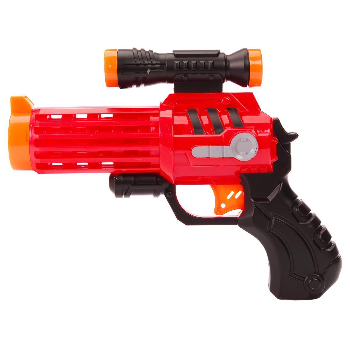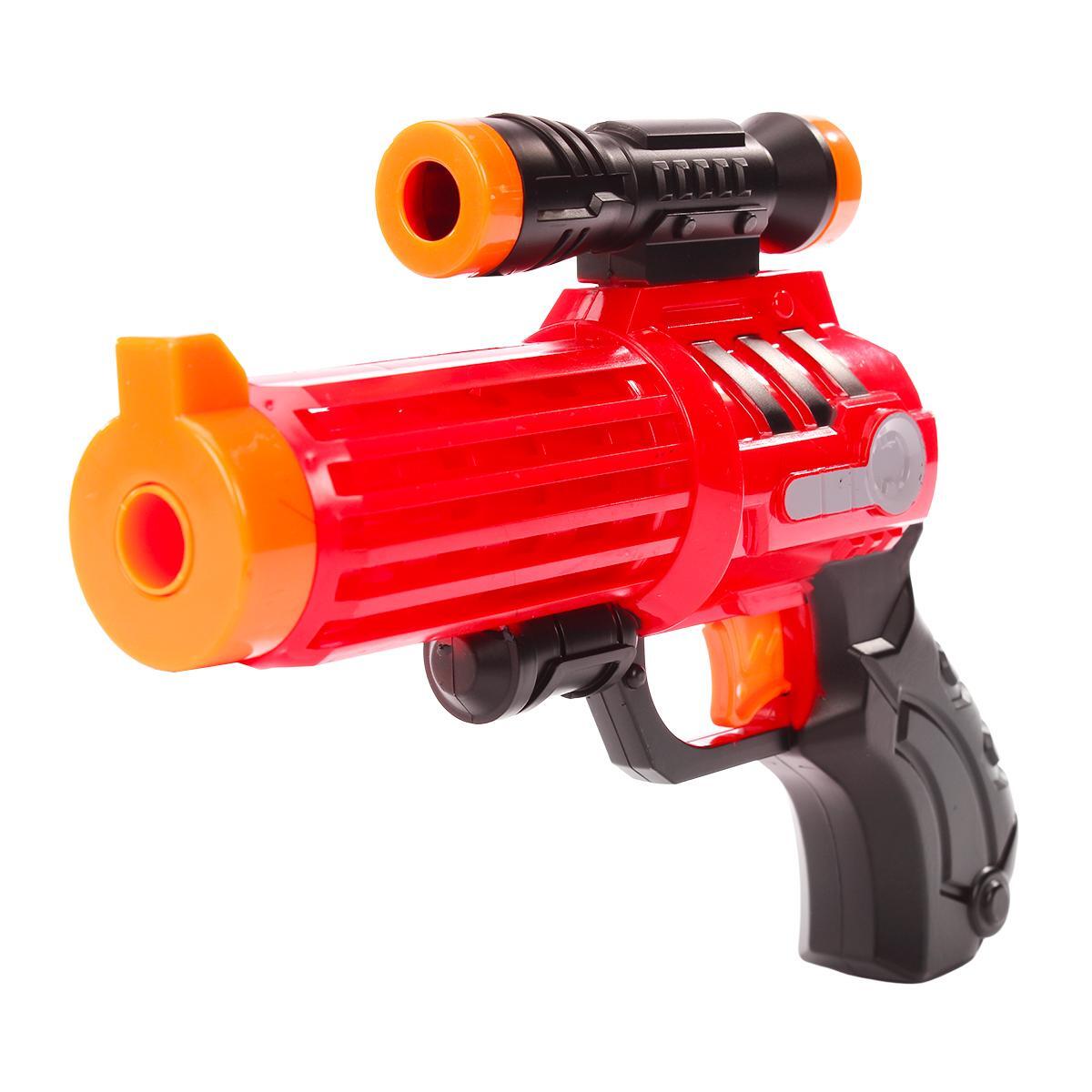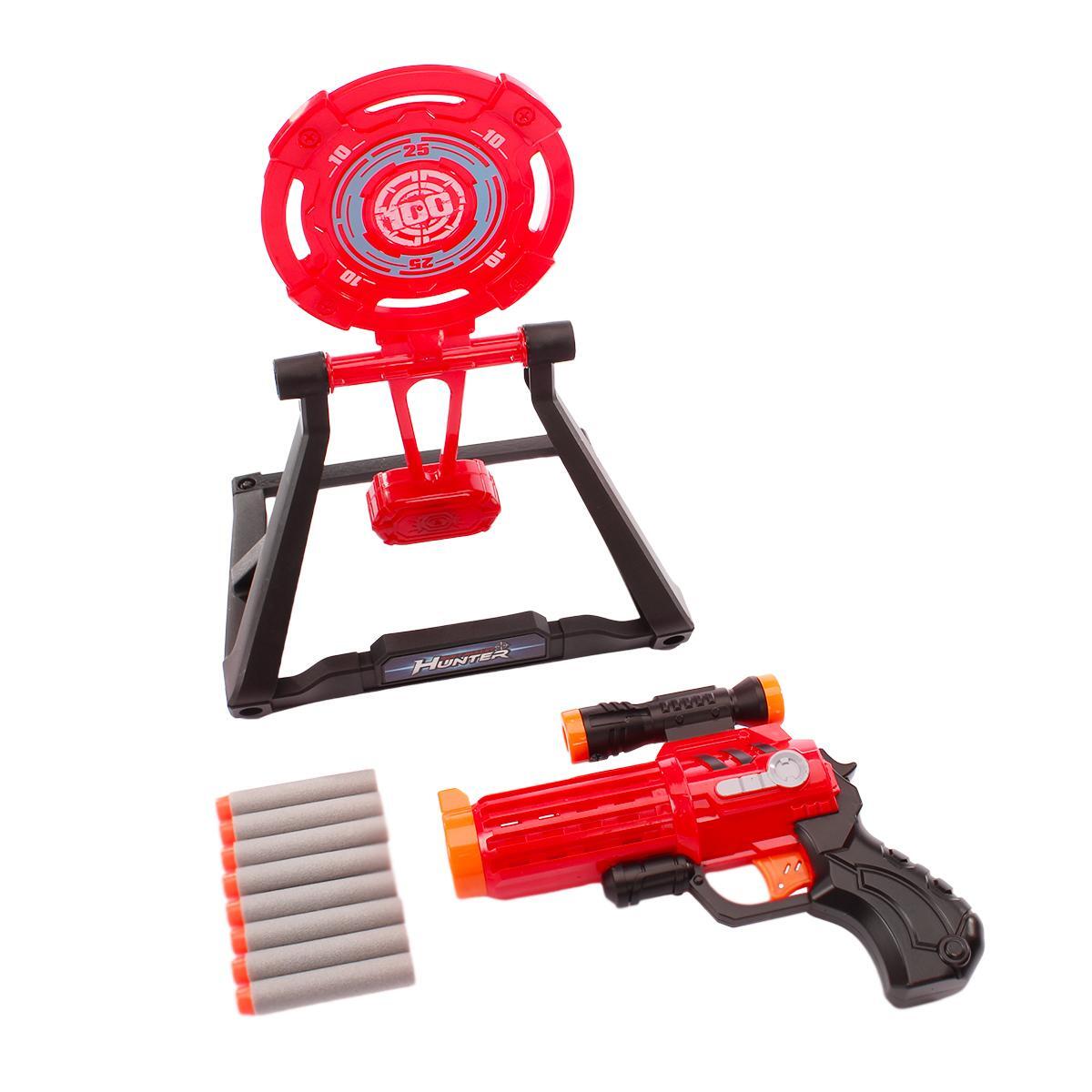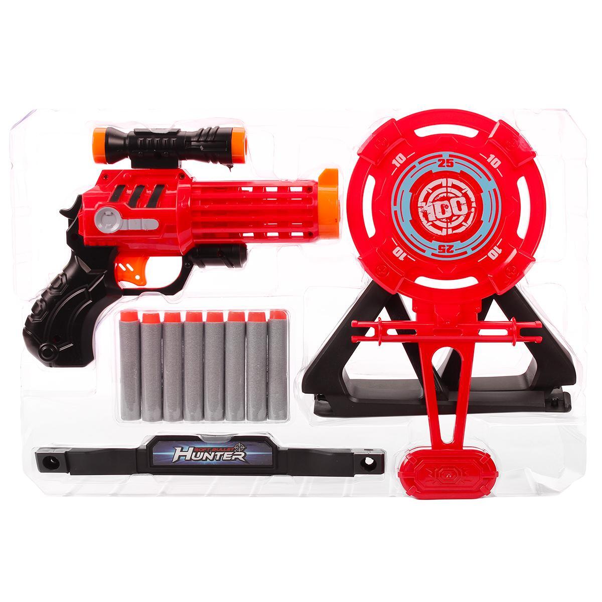 Игрушка легко используется: заряжается мягкими патронами, стреляет по мишени, которая имеет цифры для подсчета очков. Пистолет выполнен из легкого, прочного пластика, устойчивого к ударам, а яркий дизайн стимулирует интерес ребенка.