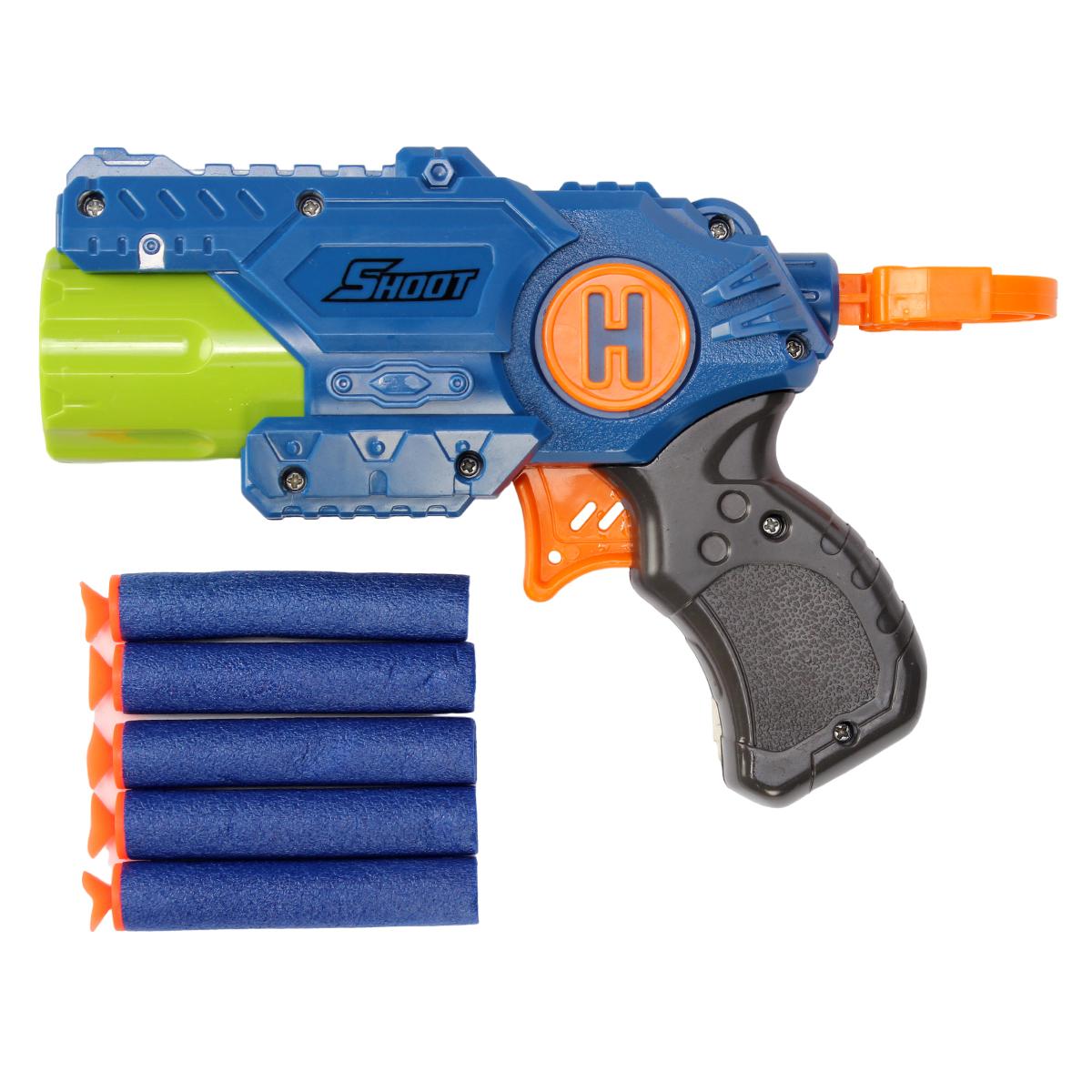 Пистолет выполнен из прочного пластика и представлен в ярких цветах: синий и зеленый с оранжевыми элементами. Он оснащен удобной рукояткой с рифлением, что обеспечивает надежный захват во время игры. В комплект входят 5 мягких пуль, которые безопасны для детей и не причиняют вреда. Пистолет имеет механизм для запуска пуль, что делает процесс игры еще более захватывающим.