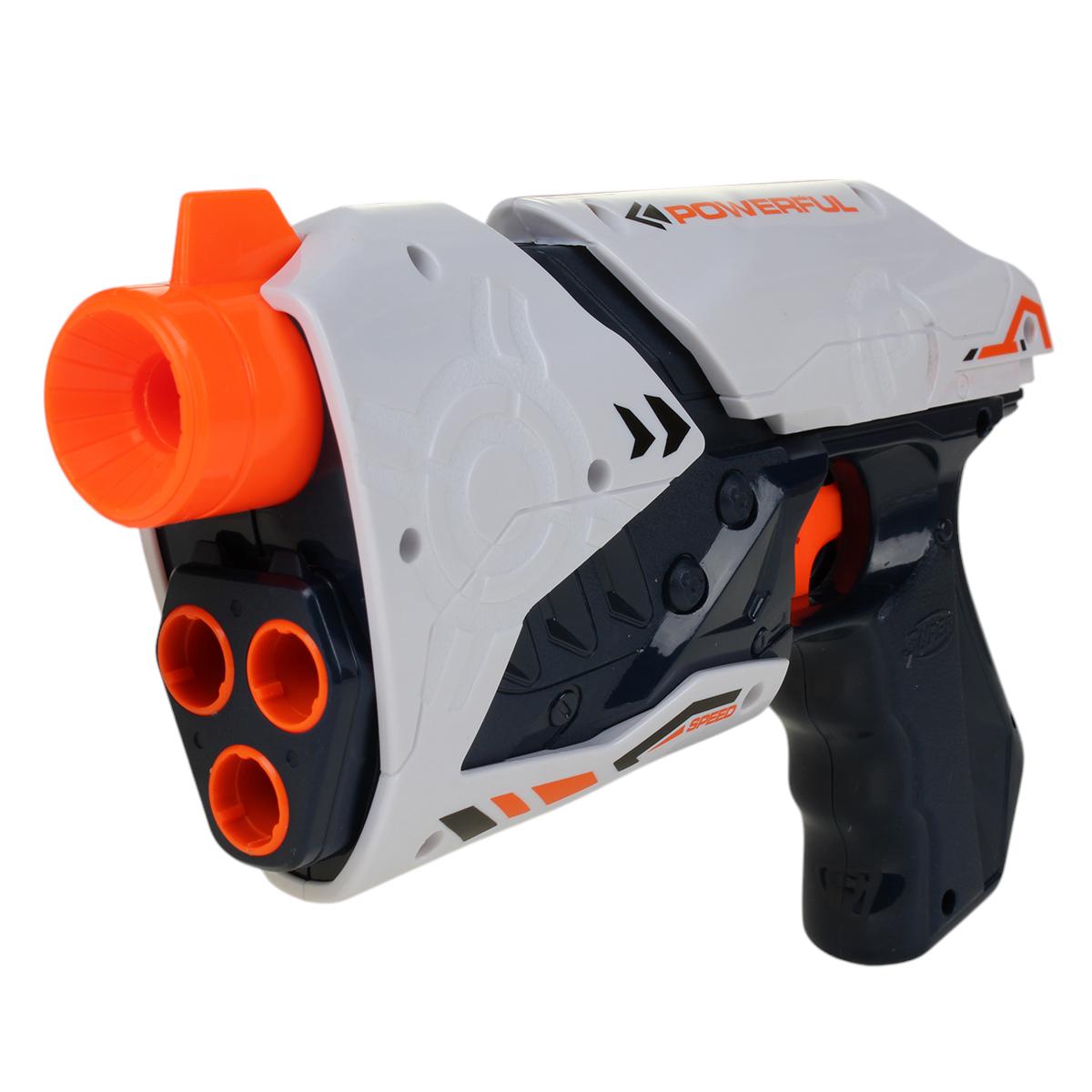 Пистолет выполнен из прочного пластика и имеет компактные размеры 24,5 см в длину, 15 см в высоту и 5,8 см в ширину. Он оснащен тремя стволами для мягких патронов, что позволяет стрелять на значительные расстояния. Удобная рукоятка обеспечивает комфортное удержание, а яркие оранжевые акценты делают его привлекательным для детей.