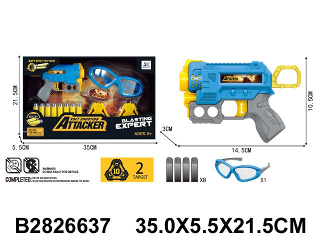 Размер самого пистолета составляет 14.5 см в длину, 10.5 см в высоту и 3 см в ширину, что идеально подходит для детской руки. Весь набор аккуратно упакован в коробку с прозрачным окном, что делает его отличным готовым подарком. Габариты упаковки: 35 см х 5.5 см х 21.5 см.