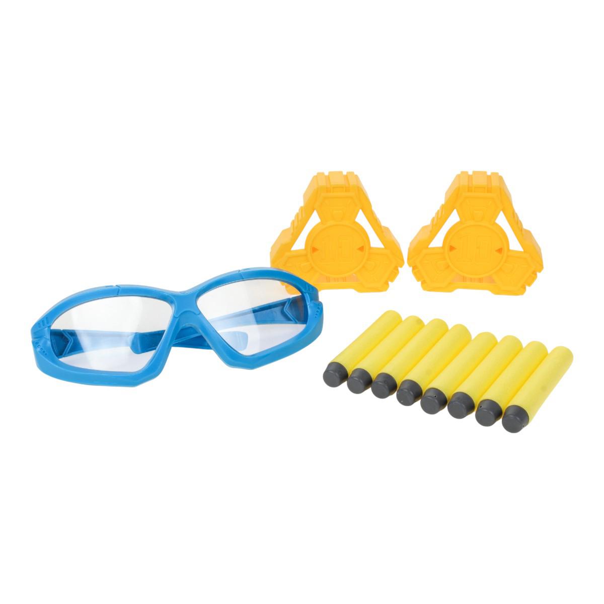 Все элементы набора изготовлены из качественного, прочного пластика. Защитные очки с прозрачными линзами надежно оберегают глаза во время игры. Мы настоятельно рекомендуем соблюдать простое правило: никогда не целиться в лицо или глаза. Игра предназначена для использования на открытом пространстве или в просторной комнате.