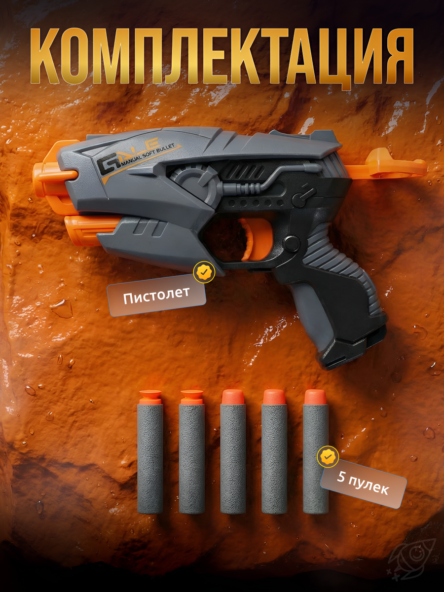 - Безопасная стрельба: В комплекте идут 5 мягких поролоновых патронов с яркими оранжевыми наконечниками. Они лёгкие, не травмируют и не оставляют следов.