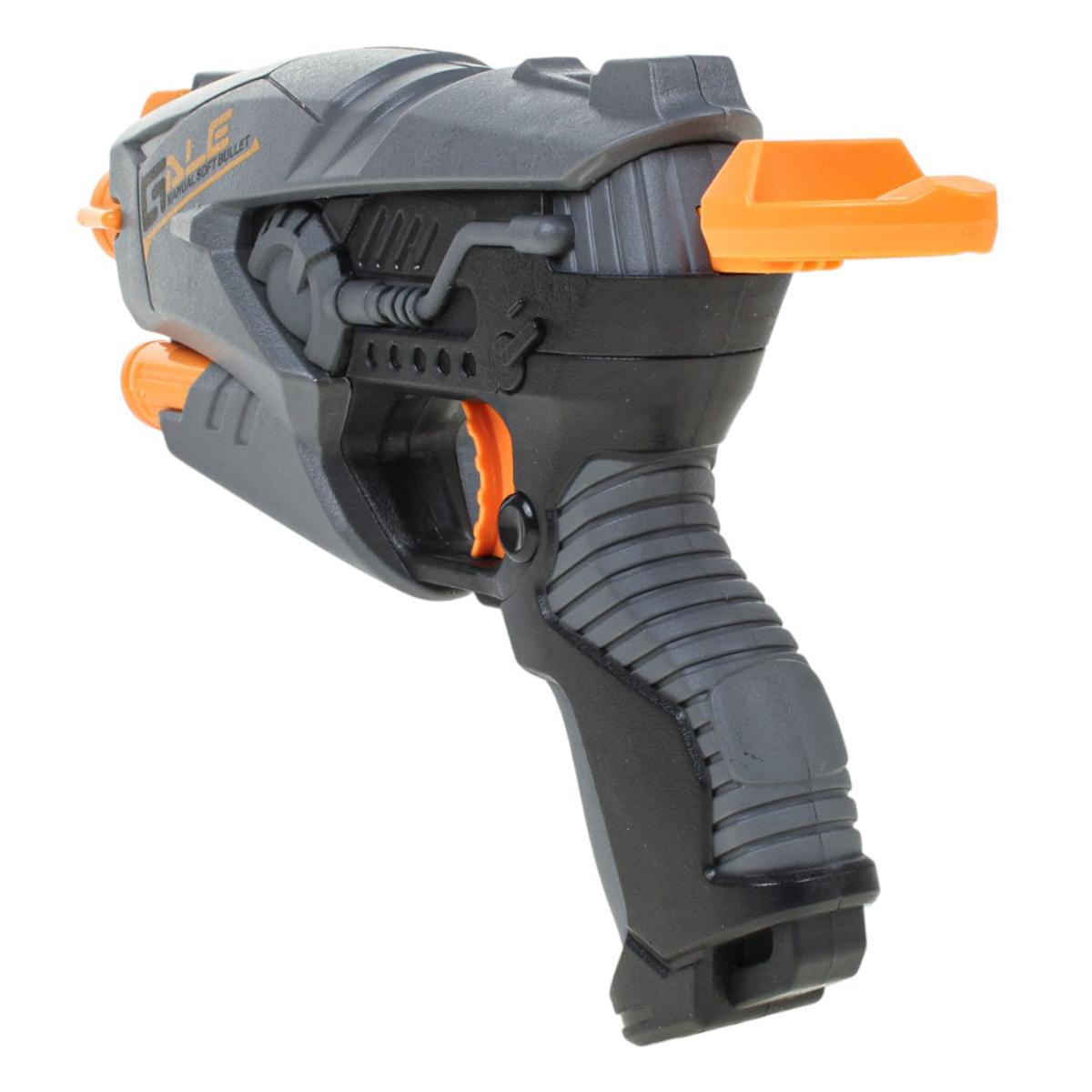 - Стильный дизайн: Пистолет выполнен в современном футуристическом стиле. Сочетание серого, чёрного и оранжевого цветов, рельефные элементы и надпись "SOFT BULLET GUN" на корпусе делают игрушку очень реалистичной и привлекательной для детей.