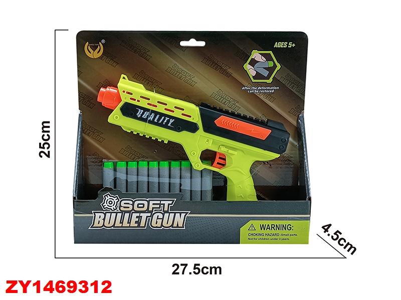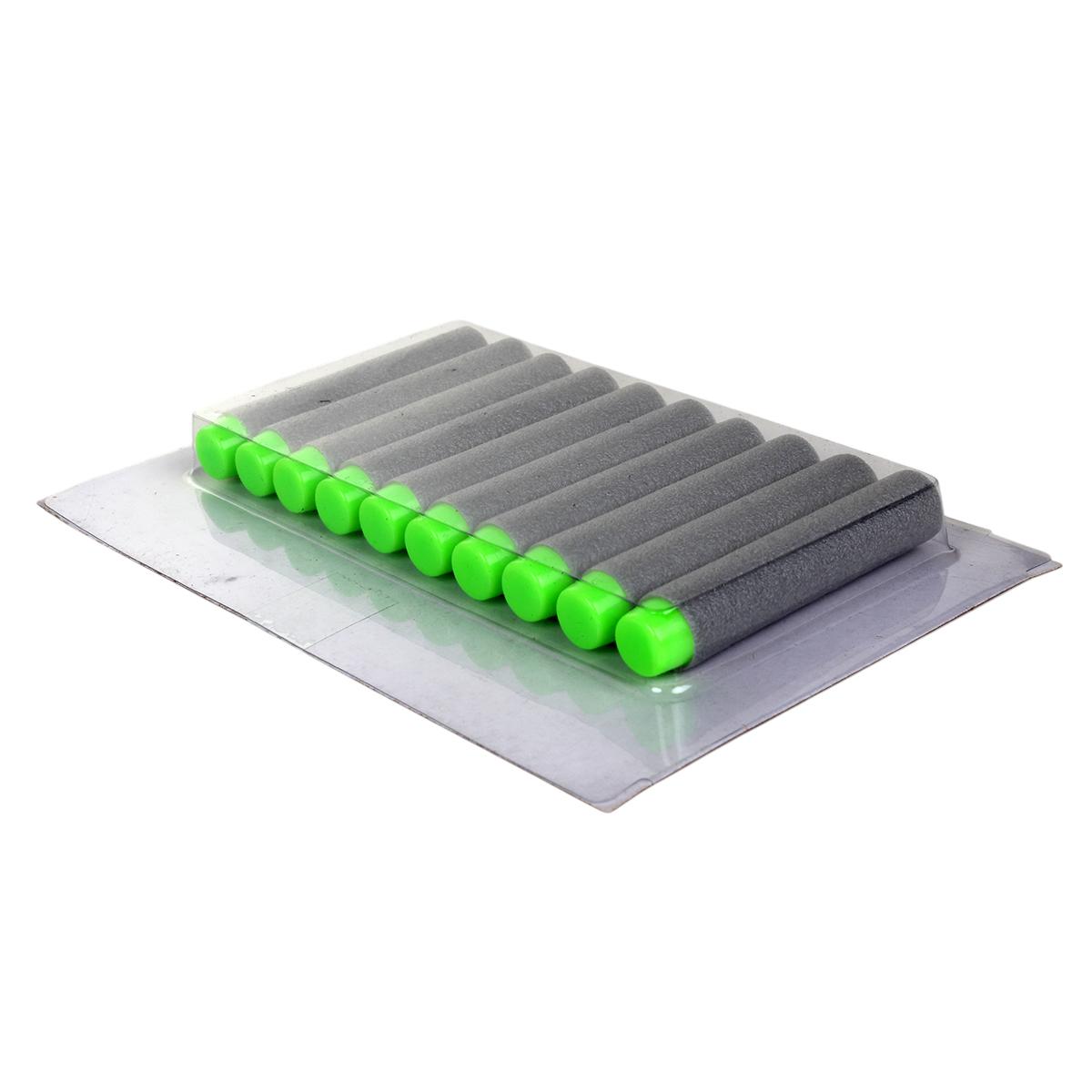 В набор входит 10 мягких пуль серого цвета с зелеными наконечниками. Гладкая поверхность всех элементов исключает царапины и занозы. Размеры пистолета 27,5 × 25 × 4,5 см оптимальны для детской руки.