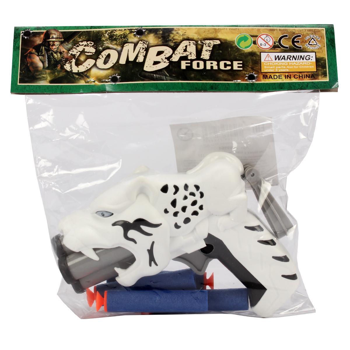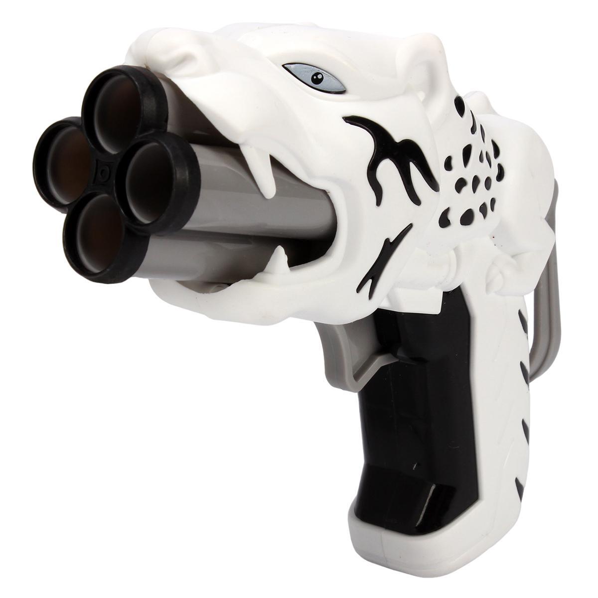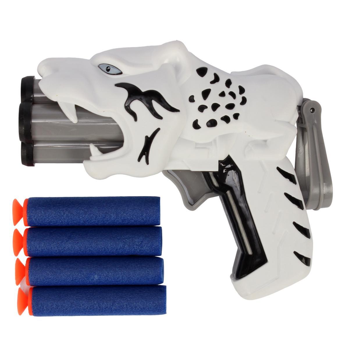 Пистолет выполнен из высококачественного пластика, обладает длиной 20 см, что обеспечивает удобную хватку и управляемость. В комплект входят 4 синих картриджа с оранжевыми наконечниками и 3 мягких мячика, подходящих для безопасных игр. Благодаря оригинальному дизайну в виде головы животного, изделие становится не только игровым аксессуаром, но и ярким элементом детской комнаты.