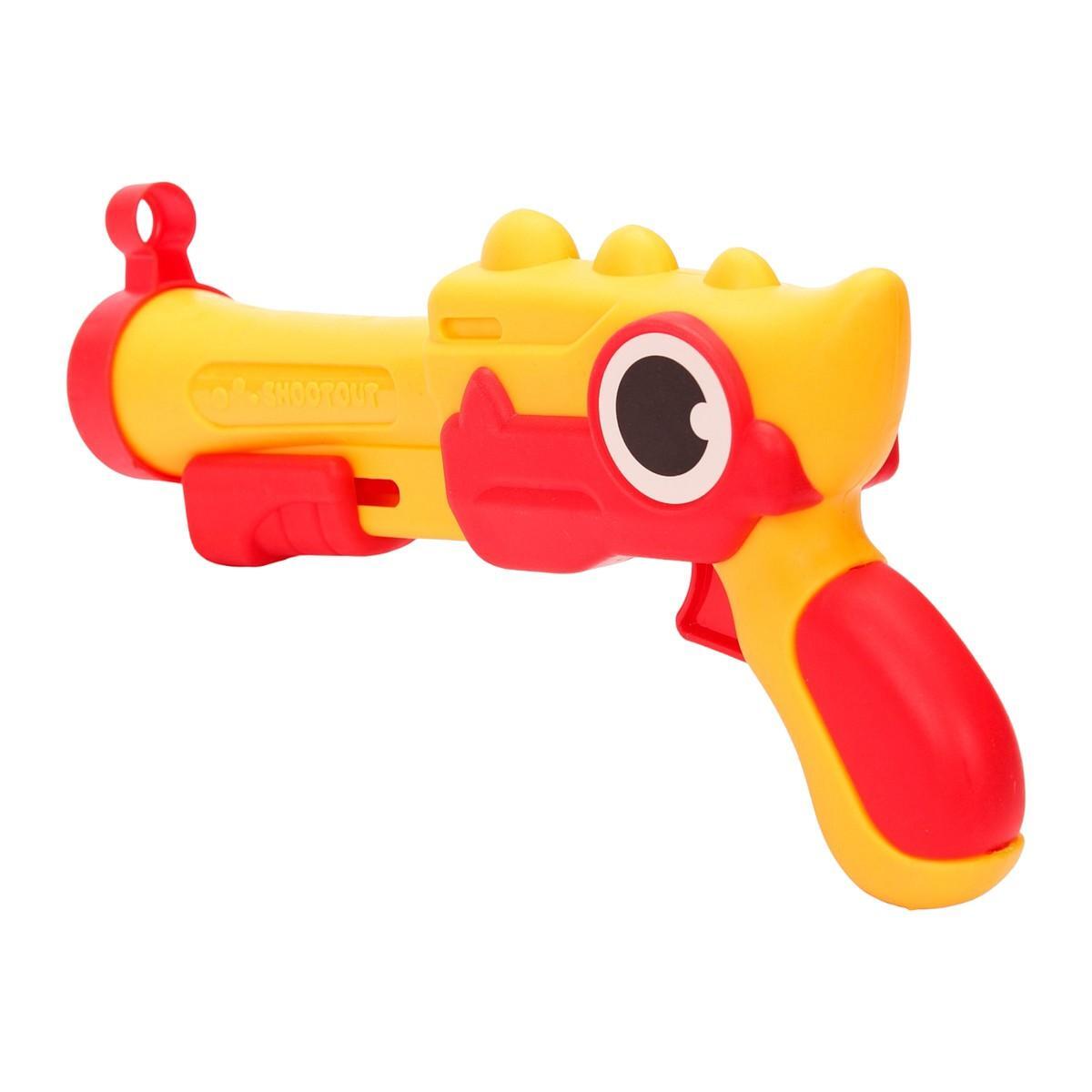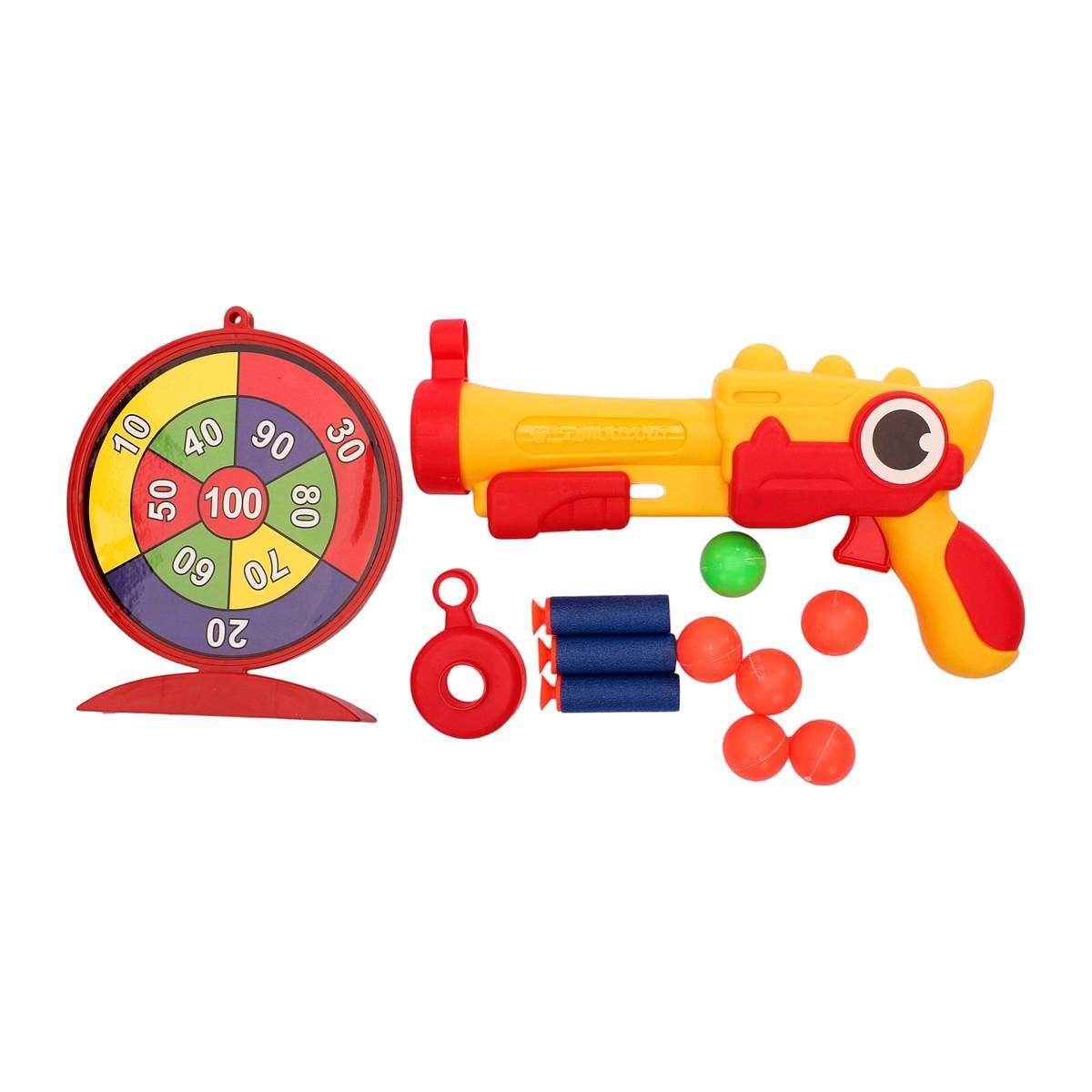 В комплект входит всё необходимое для игры: 1 пистолет с ergonomic рукояткой, 2 мягких патрона синего цвета, 6 шаров (красные и зелёные), 1 мишень с вращающимся диском. Яркий желто-красный дизайн с элементами в виде глаз делает игрушку визуально привлекательной. Все компоненты выполнены из durable пластика, устойчивого к ударам.