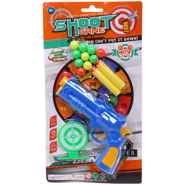 Пистолет предназначен для активных игр на свежем воздухе или в помещении. В комплект входят разноцветные шары и желтые капсулы, которые легко устанавливаются в пистолет. Мишень с числами от 1 до 20 поможет ребенку развивать меткость и концентрацию. Игрушка подходит для детей старше 3 лет, обеспечивая безопасное развлечение.
