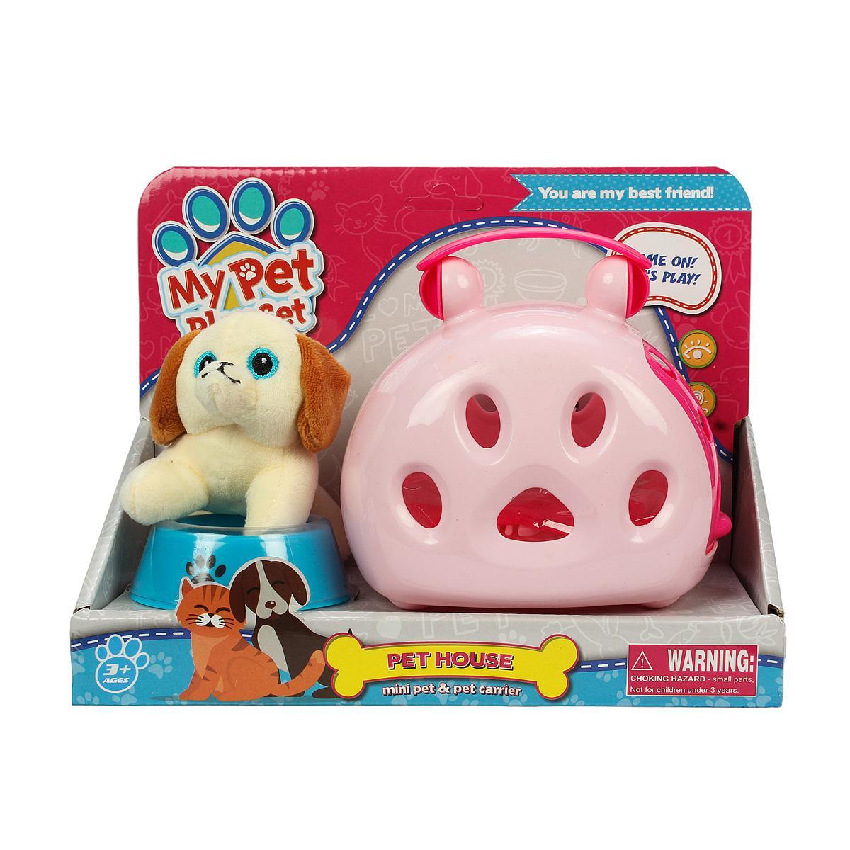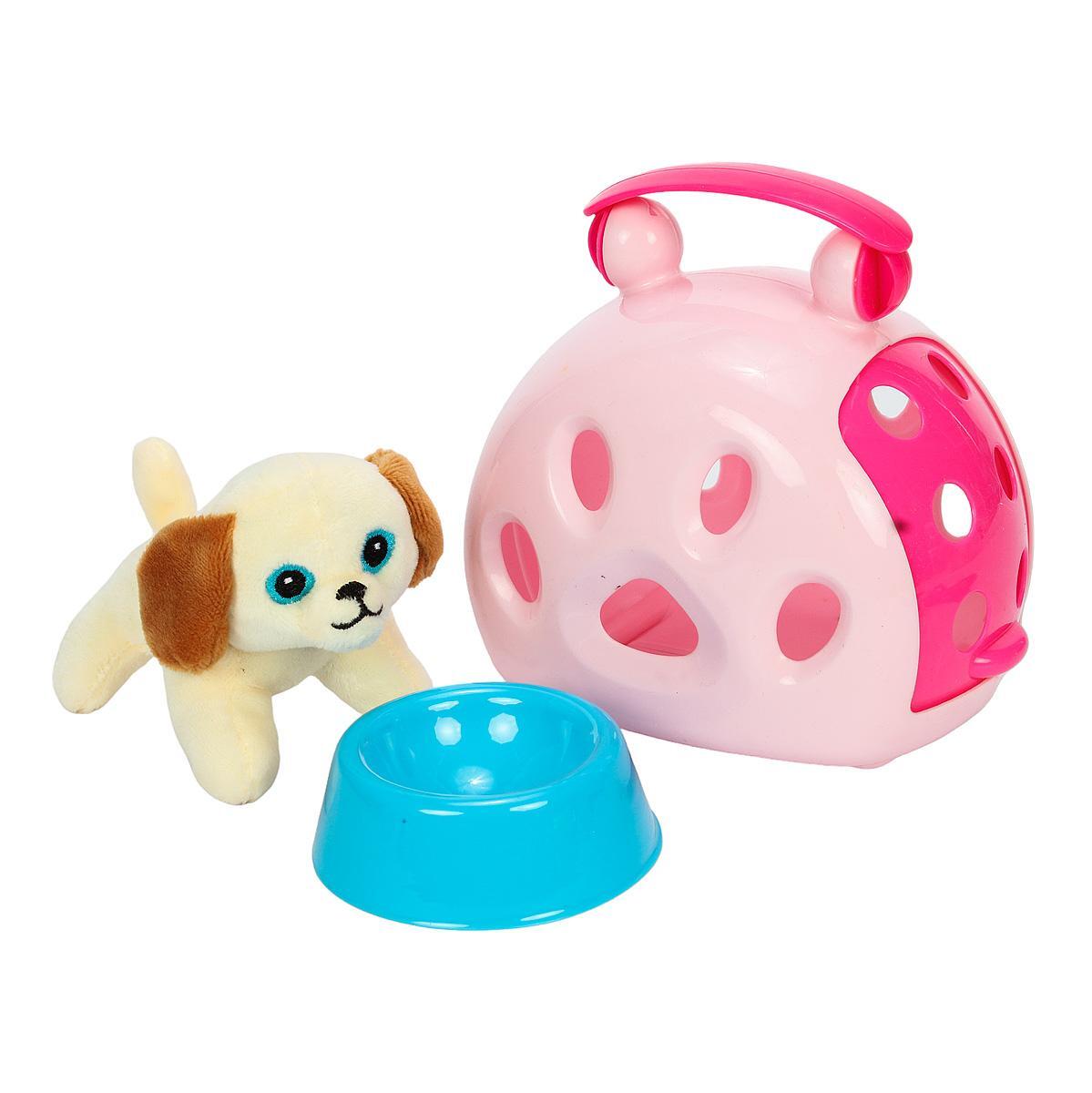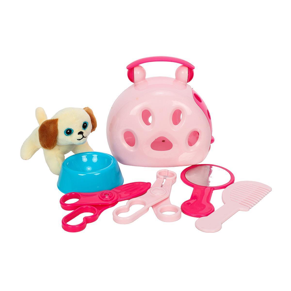Это полноценный набор для ухода и игр, созданный специально для любителей животных и их малышей. В комплект входит мягкая игрушка-собака, пластиковый домик, миски в голубом и розовом цвете, а также инструменты для ухода: расческа, ножницы, зеркало и контейнер для перевозки.
