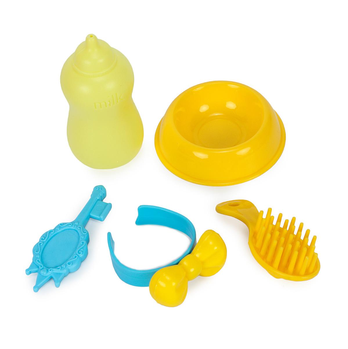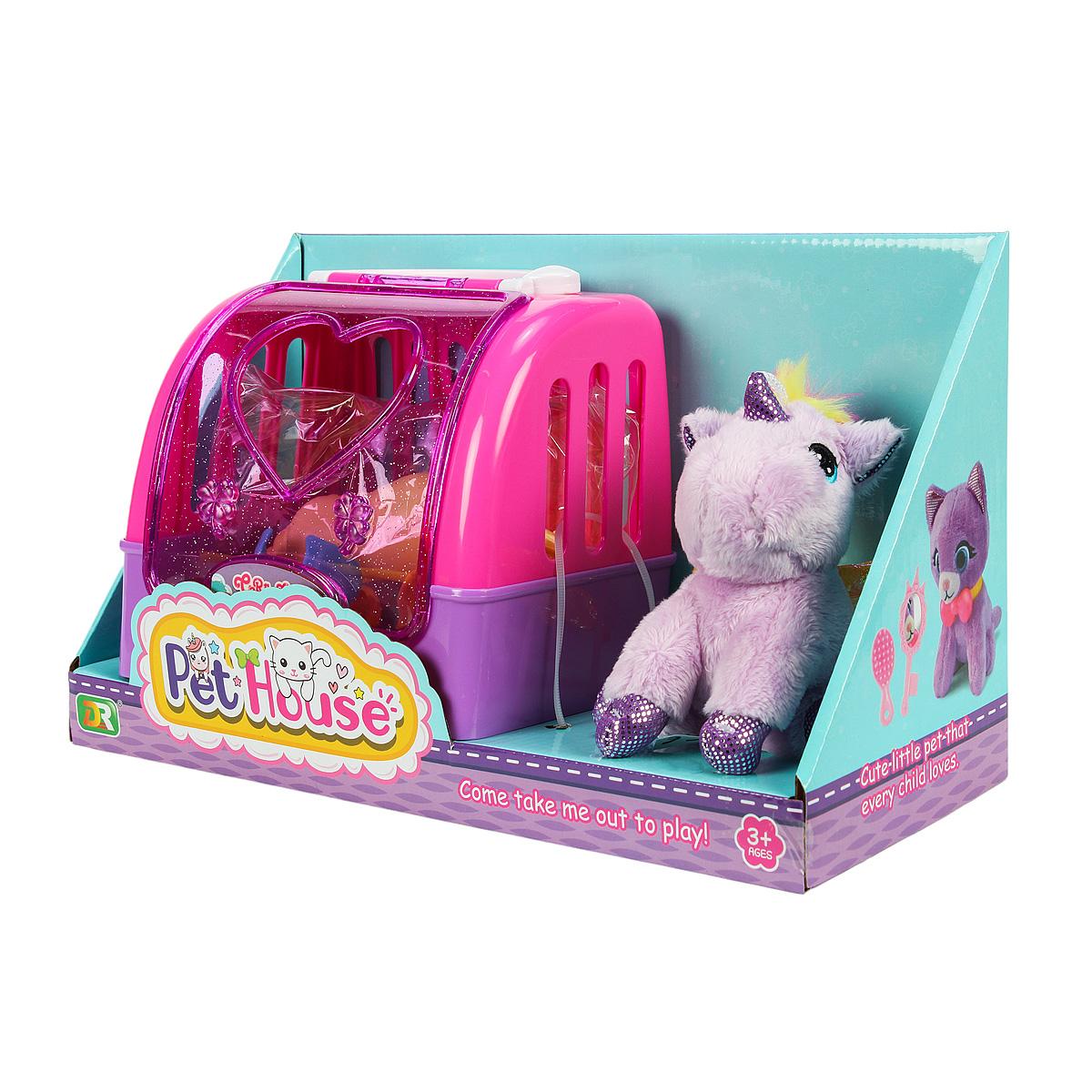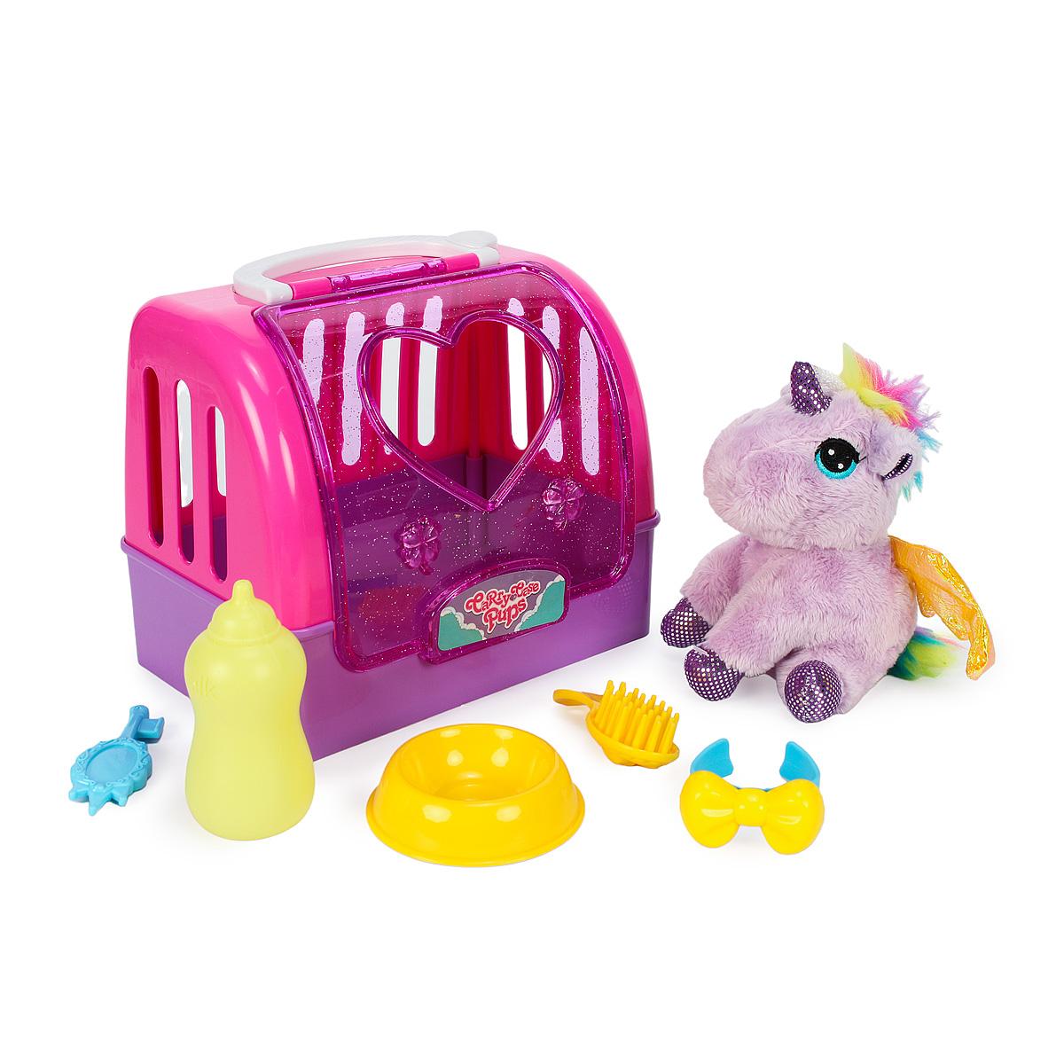 Этот набор включает в себя мягкую игрушку-единорога, выполненного из приятного на ощупь материала, а также аксессуары, такие как бутылочка, миска, расческа, ободок и зеркало, позволяющие создать реалистичный образ питомца и ухаживать за ним.
